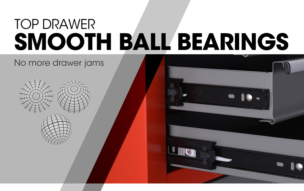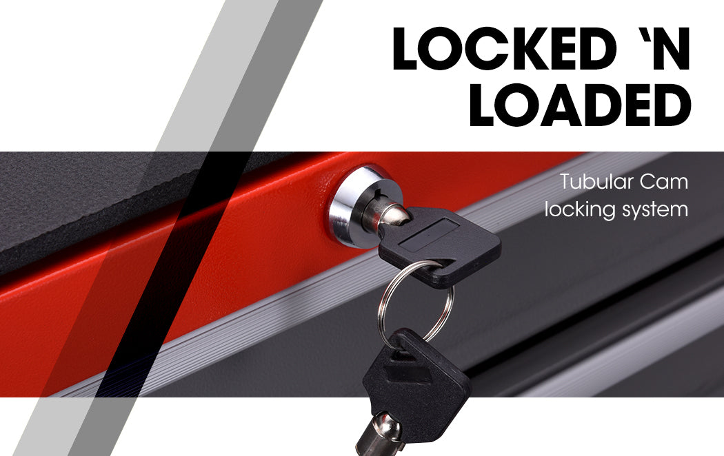 A superior tubular cam-lock system provides optimal security, with lockable drawers being perfect for storing valuable or often “borrowed” items, and the lower cabinet suitable for bulkier tools. Each drawer slides effortlessly in and out on smooth ball bearing rails, and mesh grip liners ensure your tools stay put when transporting. The cabinet also has a handy pegboard side panel offering the option to hang items.