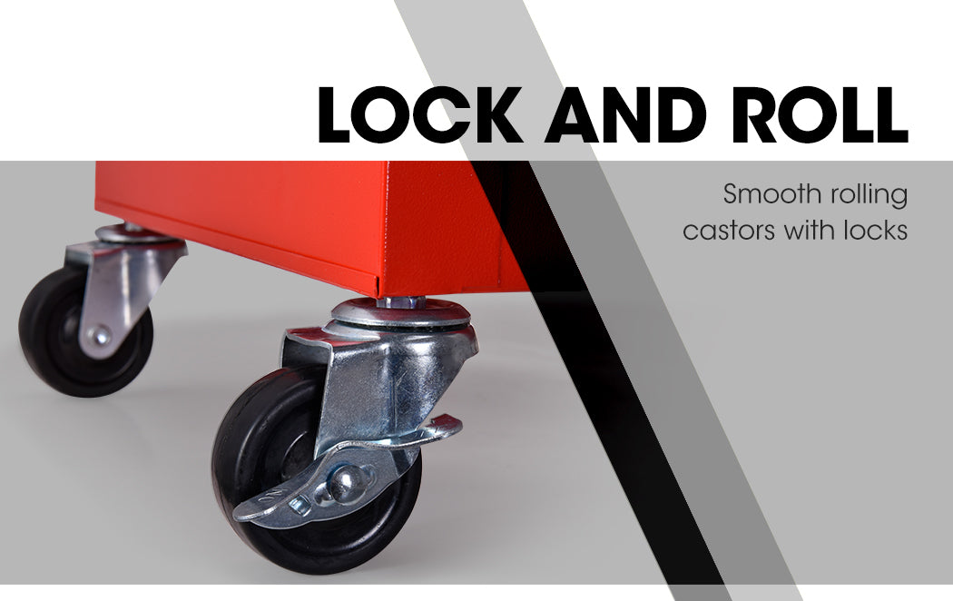 The cabinet rolls smoothly on rubber castors, and thanks to locks you have the option to secure it into position. This tool cabinet trolley offers an instant equipment and parts storage solution. It's a worthy addition to any garage workshop.