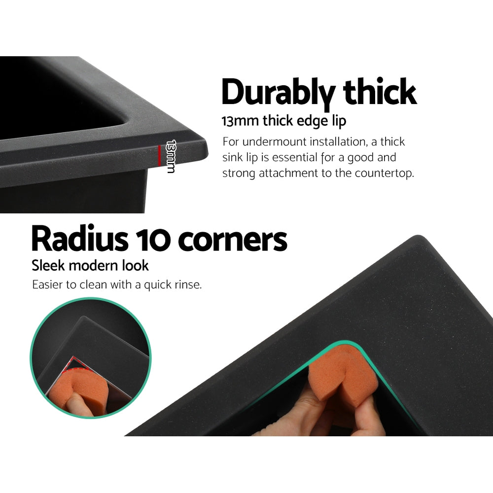 Your meals should always be prepared with safe, hygienic and food-grade equipment. That is why our Cefito Stone Sink is perfectly suited for your fine kitchen. Made from premium-quality black granite stone composite (80% granite), our 13mm thick stone sink with a silky textured surface not only looks fabulous but is also extremely durable and long-lasting. Every bit of the sink is non-toxic, lead-free and highly resistant to heat, scratches, stains and dirt. Oil will not adhere to it and neither will it fade with consistent or heavy-duty use. The quality finish along with the R10 rounded corners means the stone sink is completely easy to clean and maintain. Our stone sink also includes a 304 stainless steel corrosion-resistant waste strainer. It even comes with a five-year warranty for your peace of mind. With its contemporary finish, our stone sink is a definite stand-out in your esteemed kitchen.