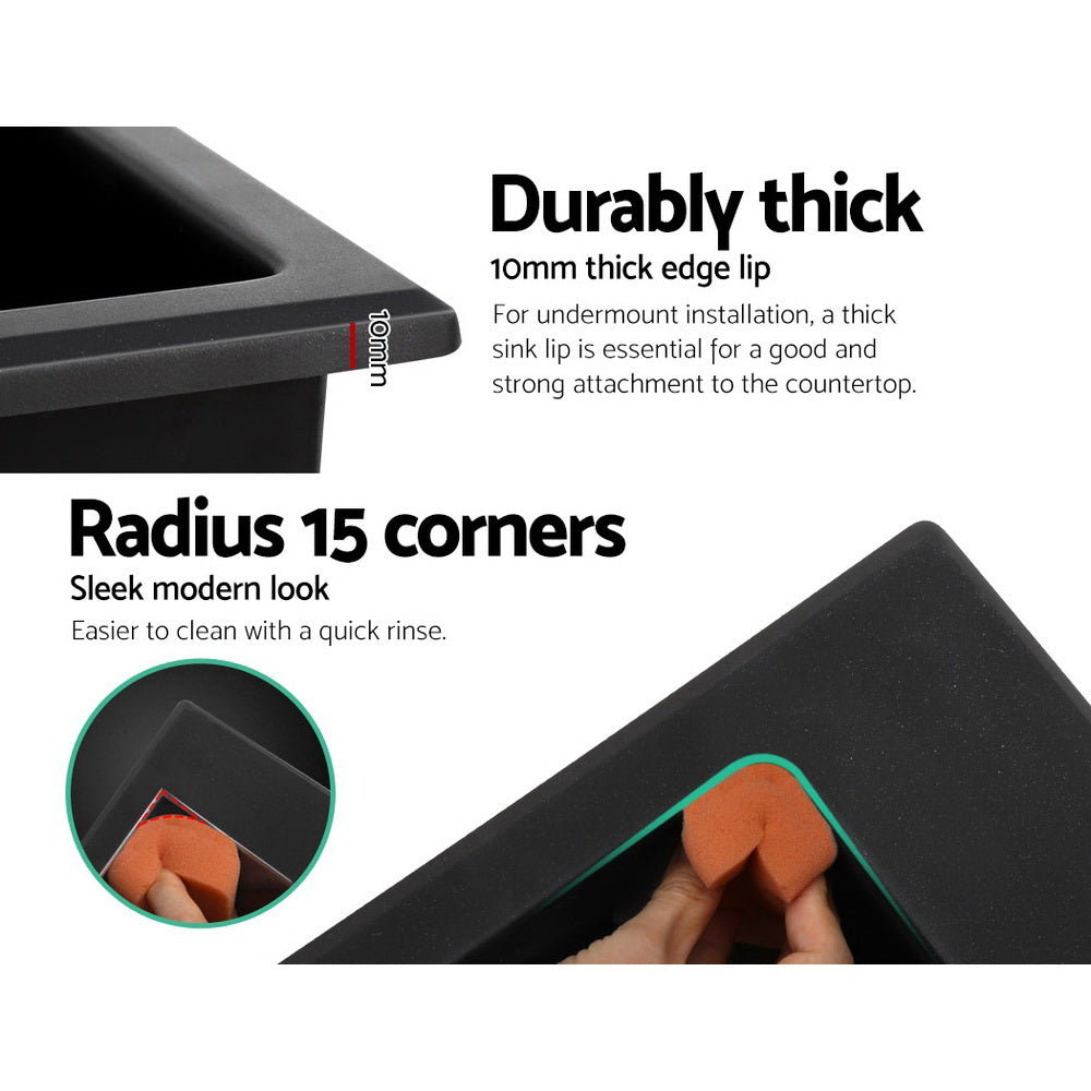 Your meals should always be prepared with safe, hygienic and food-grade equipment. That is why our Cefito Stone Sink is perfectly suited for your fine kitchen. Made from premium-quality black granite stone composite (80% granite), our 10mm thick stone sink with a silky textured surface and double bowl not only looks fabulous but is also extremely durable and long-lasting. Every bit of the sink is non-toxic, lead-free and highly resistant to heat, scratches, stains and dirt. Oil will not adhere to it and neither does it fade with consistent or heavy-duty use. The quality finish along with the R15 rounded corners means the sink is completely easy to clean and maintain. Our stone sink also includes a 304 stainless steel waste strainer. It even comes with a five-year warranty for your peace of mind. With its contemporary finish, our stone sink is a definite stand-out in your esteemed kitchen.