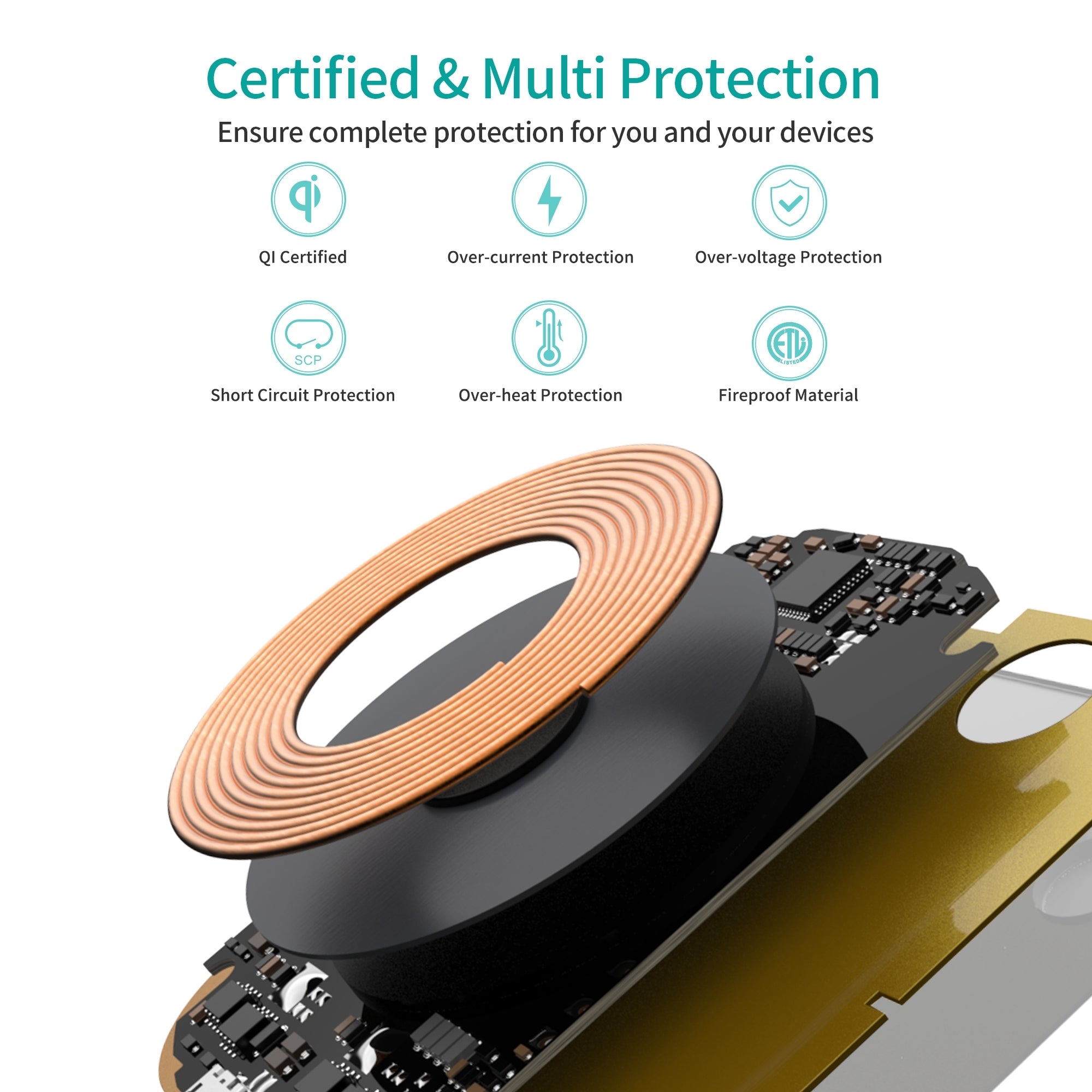 The Qi wireless charger works with QI enabled device like iPhone X/8/8 Plus, iPhone XS/iPhone XS Max/iPhone XR, Samsung Galaxy S9/Note 9/Note 8/S8/S8+/S7/S7 Edge/Note 5/S6/S6 Edge/S6 Edge Plus and other Qi-Enabled devices, Multi protection system for all-around protection against over-charging, over-voltage, over temperature and over-current, provide a safe charge to protect your devices.
