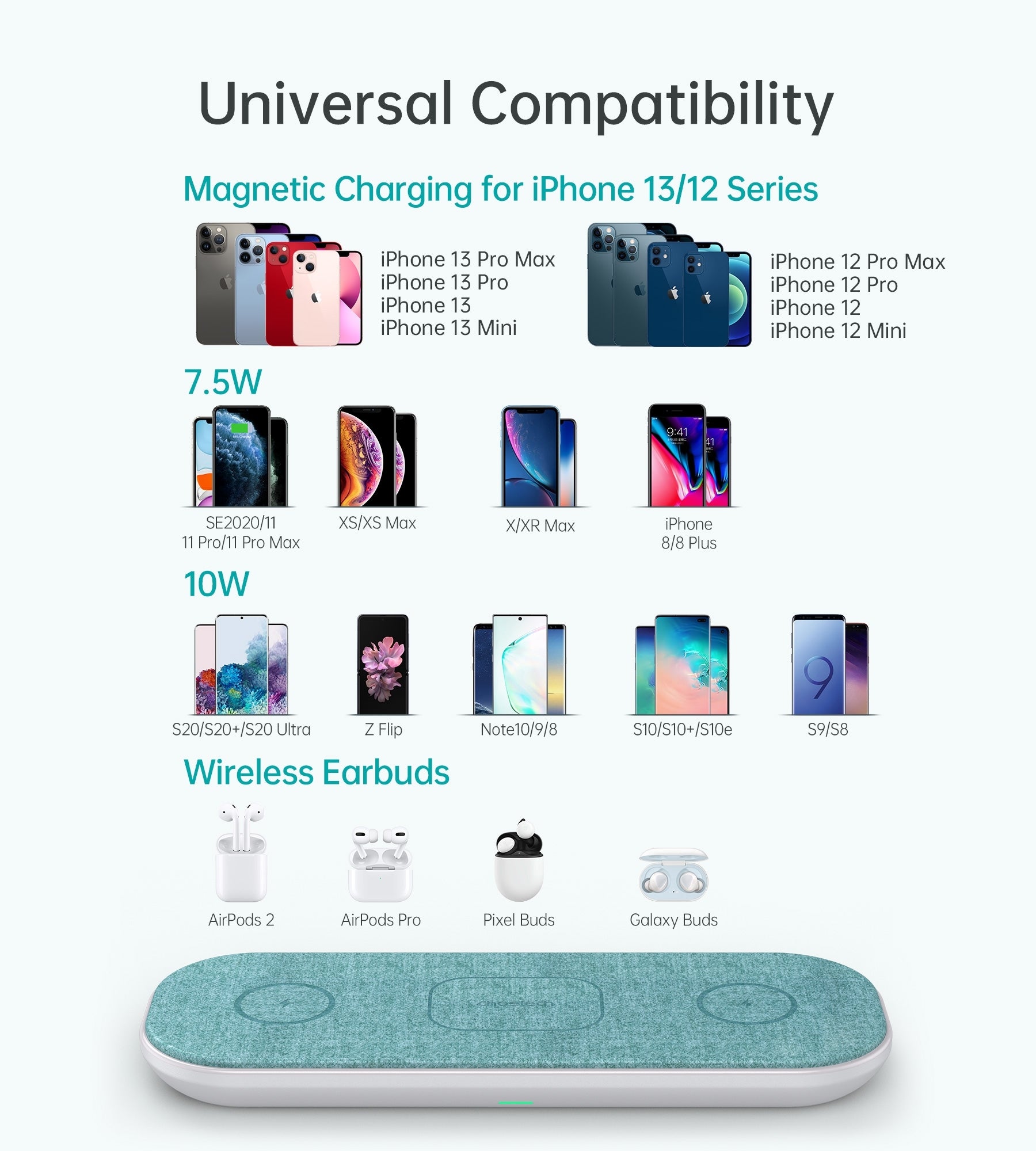 Fast mag-safe charging and precise magnetic positioning provides a super charging performance for iPhone 12/12 mini/12 pro/12 pro max. And it is also compatible with mag-safe phone case and airpods with wireless charging case, as well as other Qi-enable devices. The magnetic alignment experience only applies to iPhone 12 series.