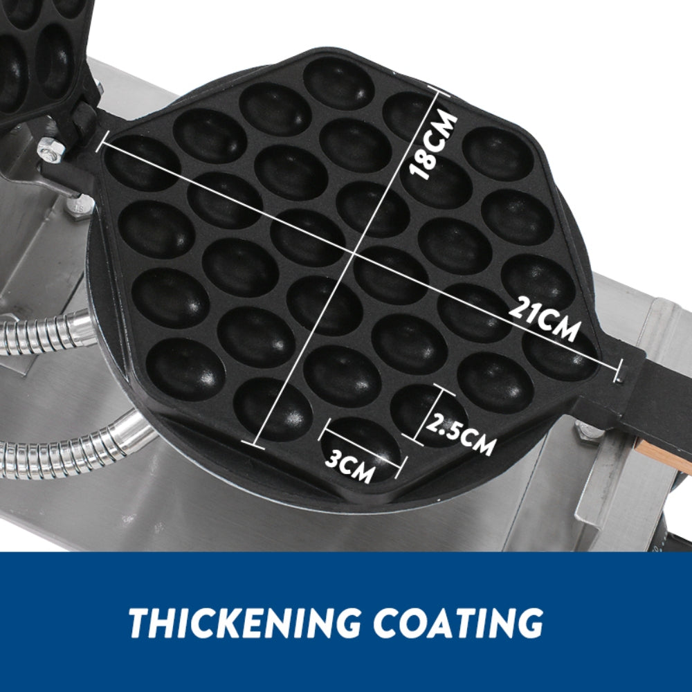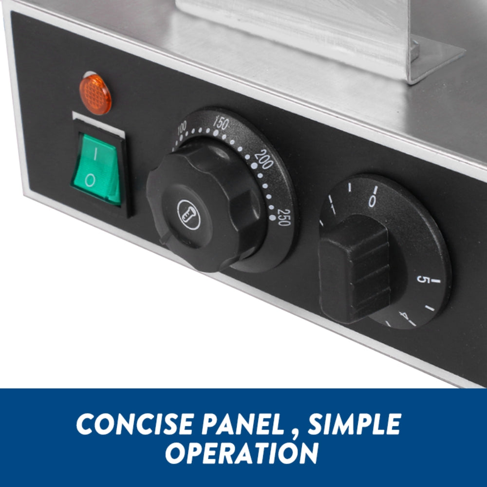 -The machine is designed for baking waffles with independent heat control and cast iron molds.