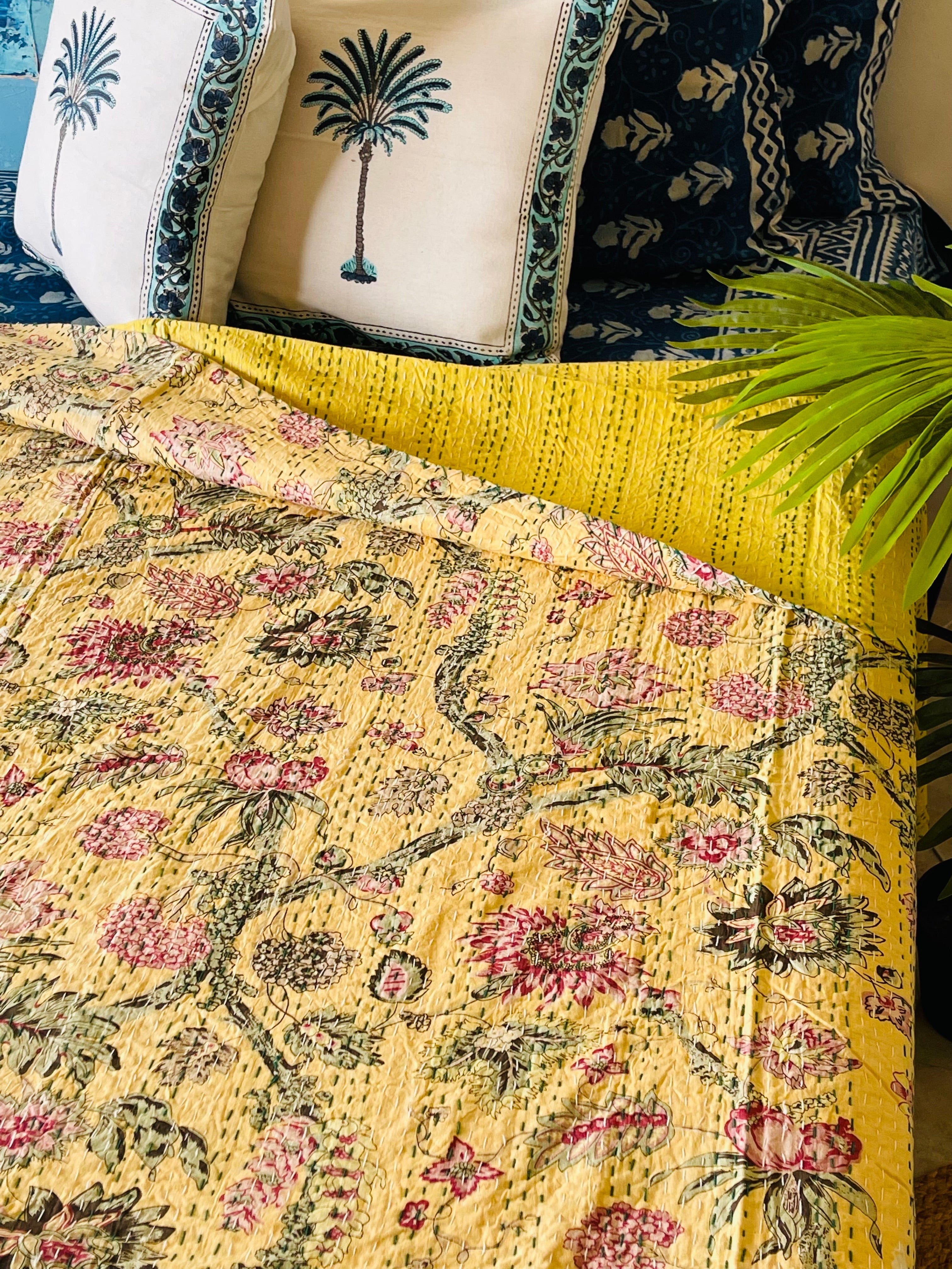 The pastel yellow floral kantha bedspread is hand printed and hand stitched by the local artisans in India. All our kantha bedspreads have got a personal touch to it, as they are all hand stitched by the women from the local villages of India, which supports and empower them. This yellow floral kantha bedspread is hand printed on a pastel yellow fabric, with pastel flowers going all around to give a subtle and relaxing touch to your space. This floral kantha bedspread can be used as a coverlet, summer quilt or a throw for the bed.