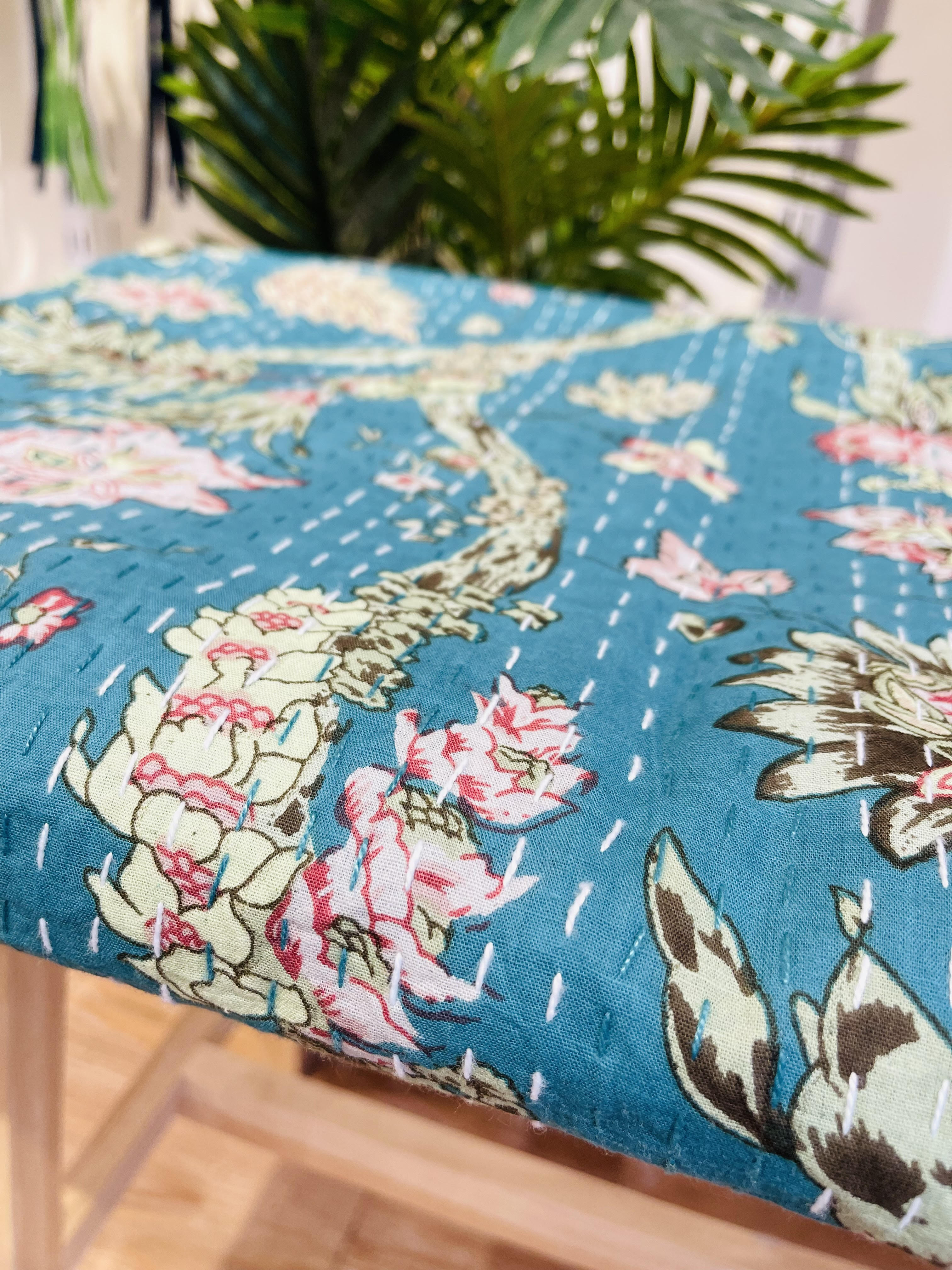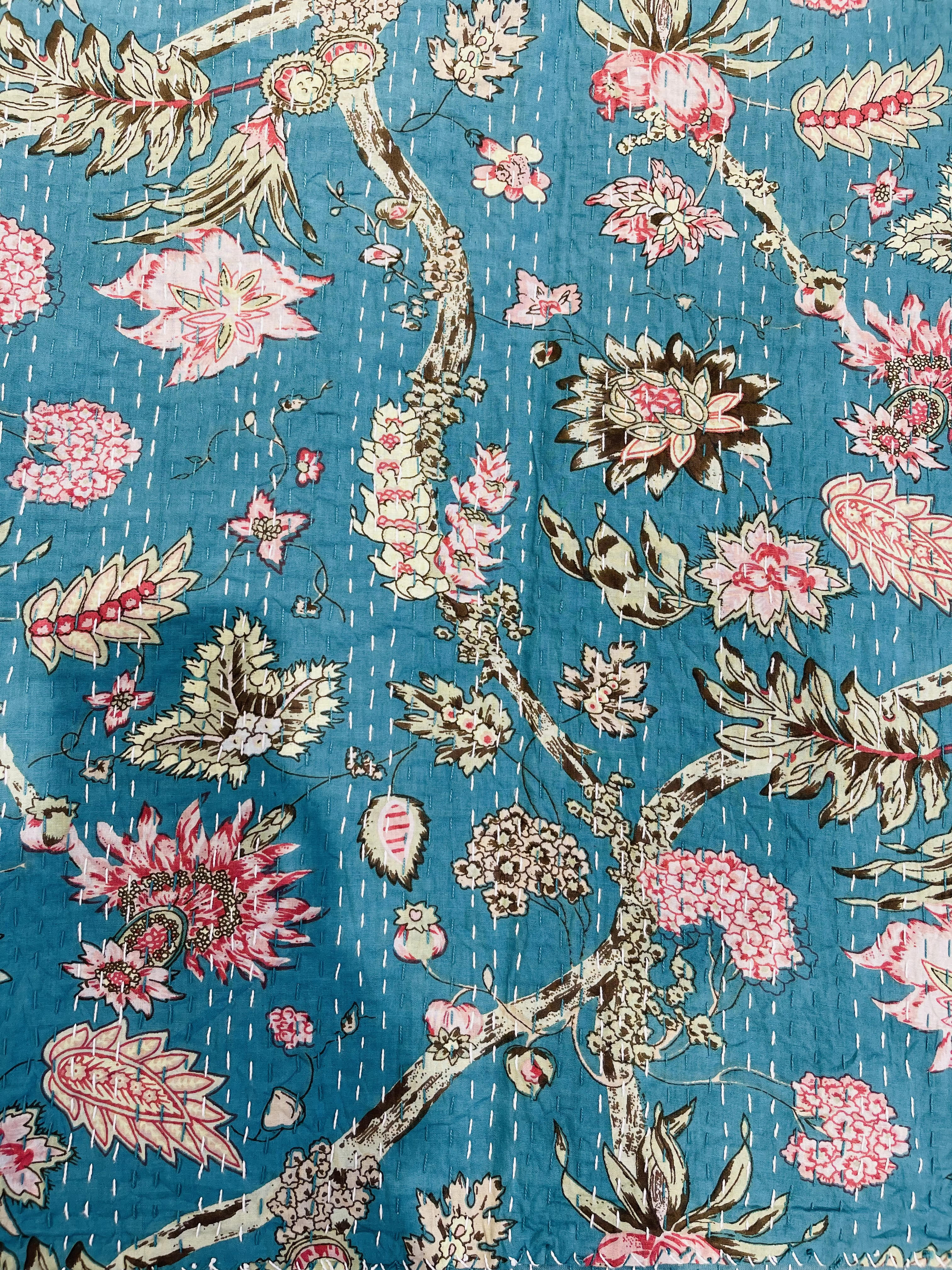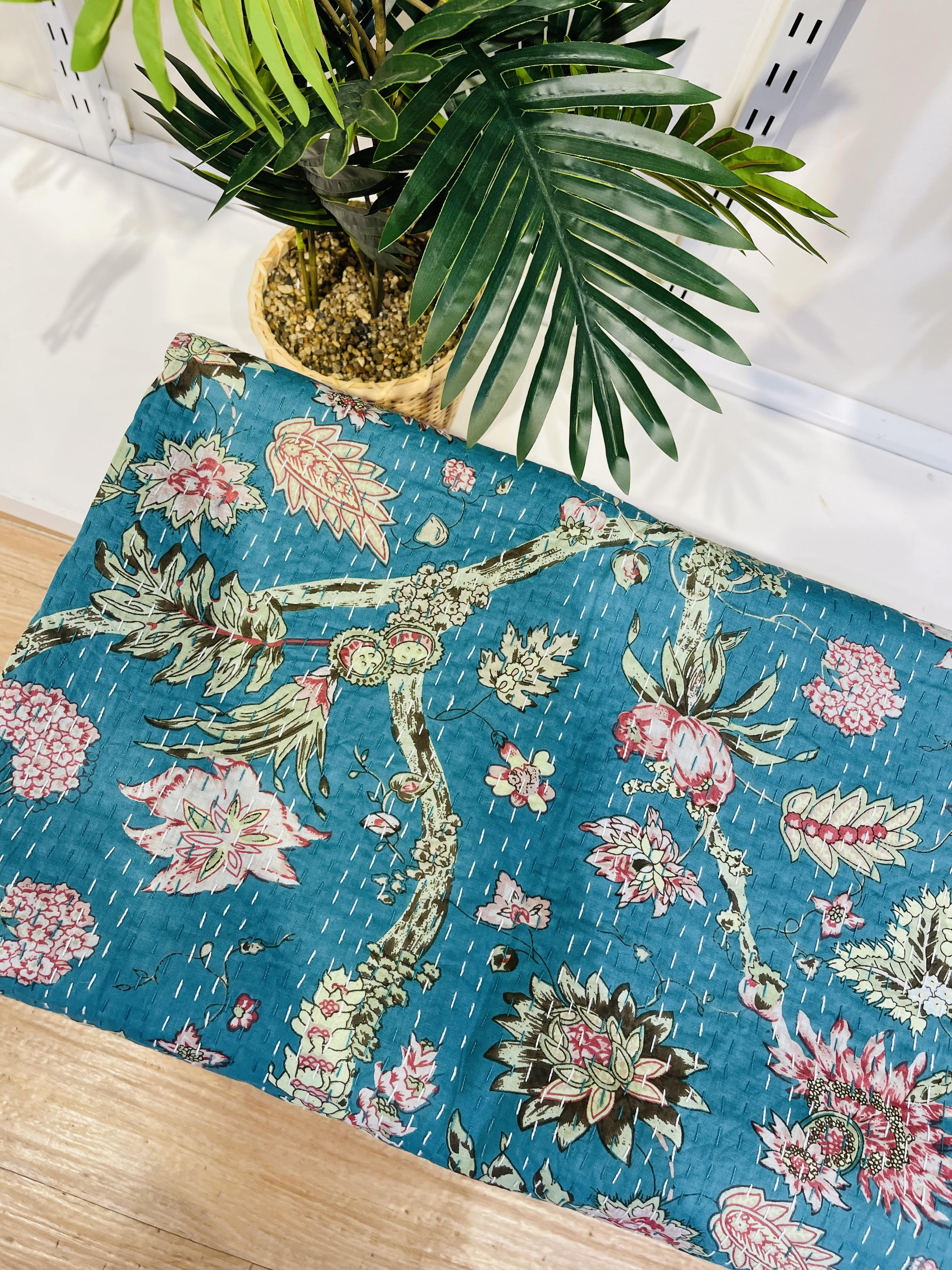 This Royal green floral Kantha is hand stitched and hand printed by the local artisans of India. It can accentuate your room space with elegance and refresh it. The print is full of bold colors, which can brighten up your beautiful space. This is a lightweight bedspread which has two cotton fabrics all hand stitched together on 100% cotton fabric. This Royal green floral kantha can be used as a bedspread, a coverlet, a quilt, or as a throw for the bed.