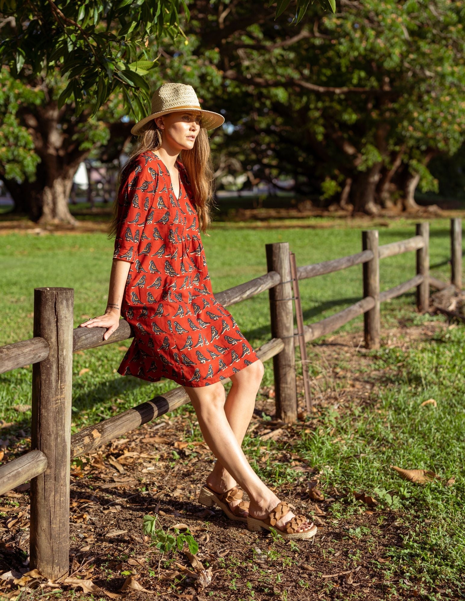 Cotton Midi Dress - Inayat Red Bird Midi Dress (Hand block print)
