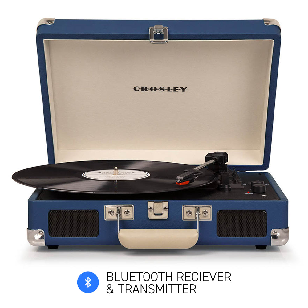 The one, the only, the original, Crosley Cruiser. Lightweight in its charming suitcase-style shell, it’s easy to use and a delight to hear. With pitch control, built-in speakers and NOW with Built-in Bluetooth receiver; stream your music via your phone to the improved stereo speakers of the turntable. Easily Switch to built-in Bluetooth transmitter and experience your records on your own wireless speakers or headphones. The Cruiser is ready to jam vinyl or your digital music. Choose from a rainbow of sound to start your vinyl adventure with this portable three-speed record player. Crosley Cruiser Bluetooth Portable Turntable - Portable Turntable, Belt Driven Turntable Mechanism, Plays 3 Speeds - 33 1/3, 45 And 78 RPM Records, Built-in Bluetooth Receiver and Bluetooth Transmitter (Connects to Bluetooth Speakers) , Auxiliary Input, Headphone Jack, RCA Audio Out, Adjustable Pitch Control, 6\" Full Range Speaker.