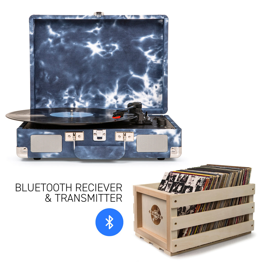 The one, the only, the original, Crosley Cruiser. Lightweight in its charming suitcase-style shell, it’s easy to use and a delight to hear. With pitch control, built-in speakers and NOW with Built-in Bluetooth receiver; stream your music via your phone to the improved stereo speakers of the turntable. Easily Switch to built-in Bluetooth transmitter and experience your records on your own wireless speakers or headphones. The Cruiser is ready to jam vinyl or your digital music. Choose from a rainbow of sound to start your vinyl adventure with this portable three-speed record player. Crosley Cruiser Bluetooth Portable Turntable - Portable Turntable, Belt Driven Turntable Mechanism, Plays 3 Speeds - 33 1/3, 45 And 78 RPM Records, Built-in Bluetooth Receiver and Bluetooth Transmitter (Connects to Bluetooth Speakers) , Auxiliary Input, Headphone Jack, RCA Audio Out, Adjustable Pitch Control, 6\" Full Range Speaker. Crosley Record Storage Crate Go crate-digging through your own collection with Crosley’s rustic wooden record crate. Fire-branded with the iconic Crosley logo this lightweight crate gives plenty of room to fill it with precious LPs. Product Features • Integrated Carry Handles • Holds approximately 75 albums • Finished In Solid Wood