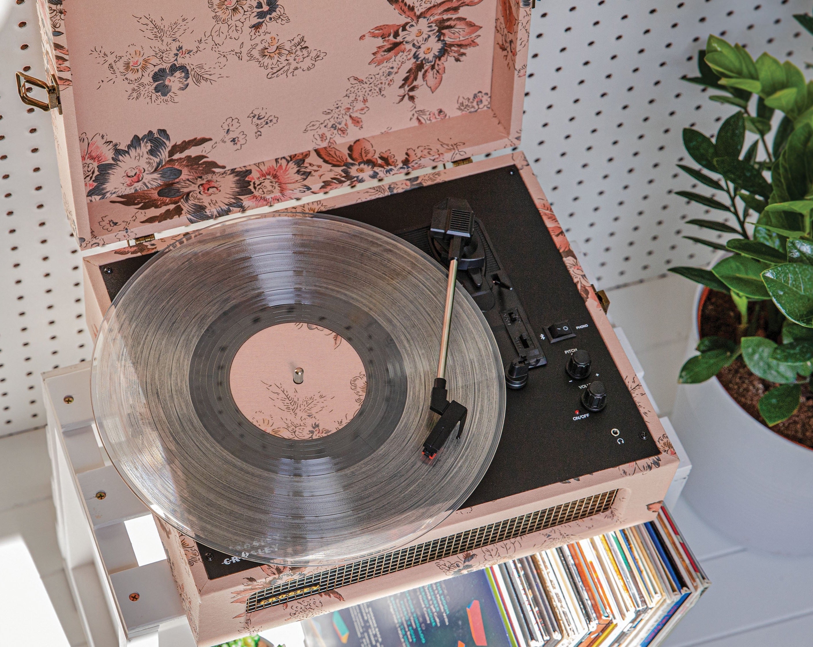 Join Crosley's mission to bring analogue music to the masses with the Voyager three-speed turntable. The clean, vintage-inspired aesthetic fits into any space, while the lightweight design allows this record player to travel “further than anyone, or anything in history.” Spin 33 1/3, 45, or 78 RPM records or launch the built-in Bluetooth transmitter or receiver to send your digital music wirelessly. Discover the RCA outputs on the back that allow you to easily plug into your existing solar music system or bigger speakers to add propulsion to any party. Drop the needle on a reissue of the golden record, probe the adjustable pitch control knob to dial in the speed and prepare for blast off!