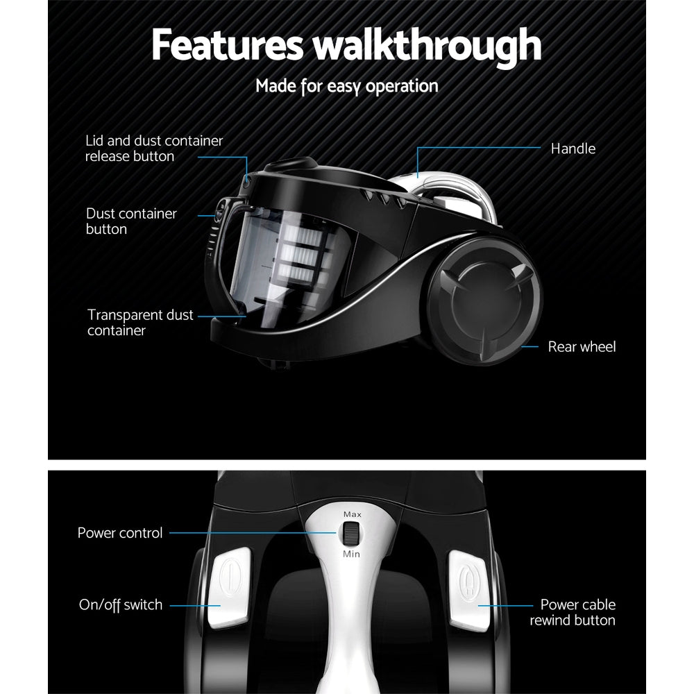 The convenience of bagless vacuuming with the power of effortless cleaning. Such is the Devanti Bagless Vacuum Cleaner that makes light work of even the toughest cleaning tasks. With its 2200W suction power, the vacuum cleaner utilizes a multi-cyclonic system that separates large debris from fine dust. The dust is filtered through a HEPA filter that eliminates up to 99.97% of allergens. Clearing the dust is an easy matter of pressing the release button to remove the lid and dust container and pouring the contents away. The HEPA filter is also washable and reusable. The vacuum cleaner comes with a retractable cord for easy mobility, a 360° rotatable hose and a telescopic stainless steel handle that can be fitted with different heads included in the accessories pack.