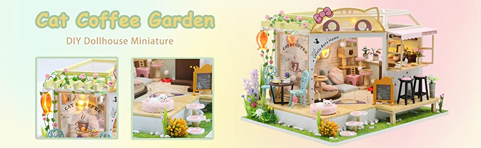 Dollhouse Miniature with Furniture Kit Plus Dust Proof and Music Movement - Cat Coffee (Valentine's Day Gift Idea)