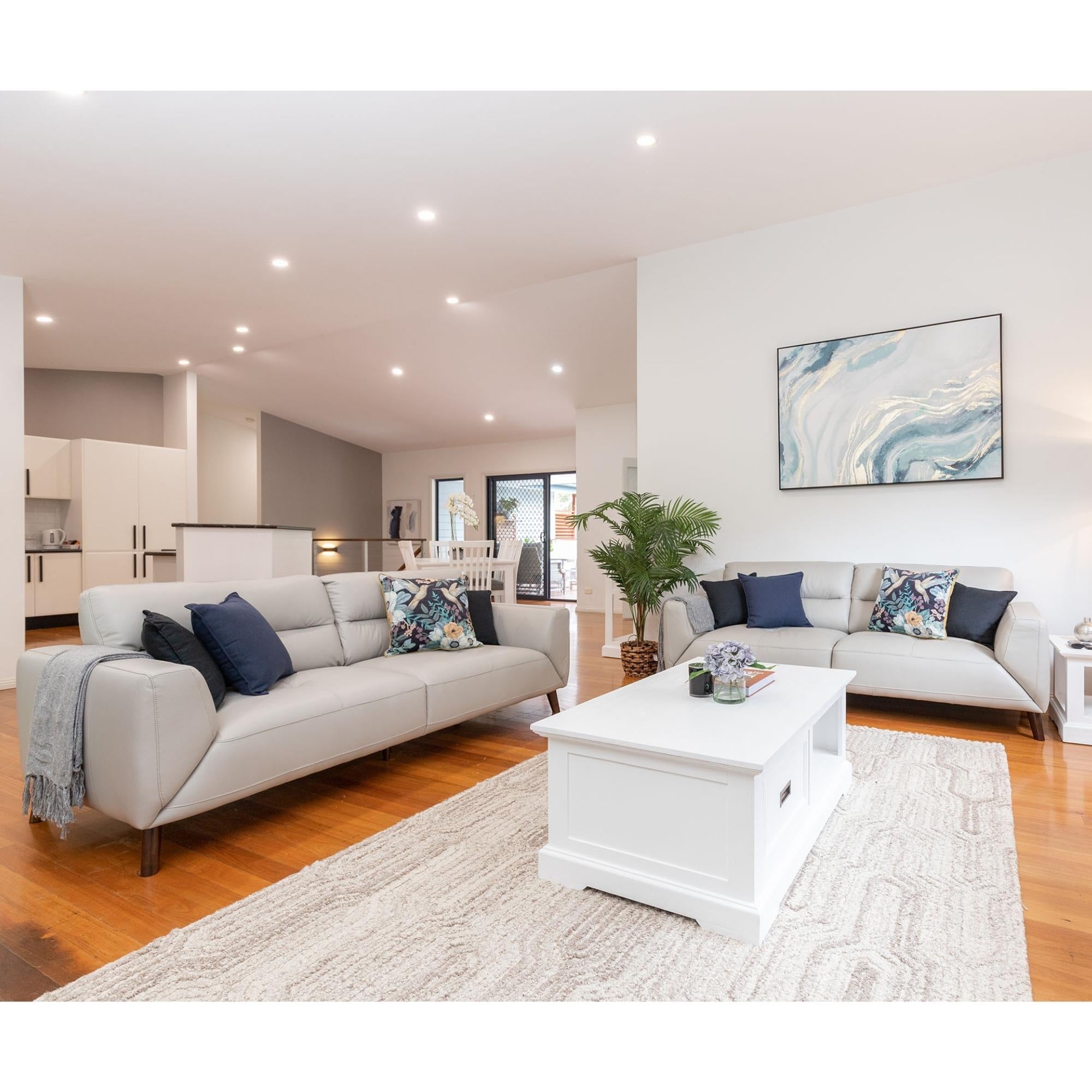 A luxurious lounge set that displays one of the best furniture arts. Place this beautiful sofa set, designed in a modern style, in your living area and see it become the most lovable corner of the house. The adorable set of 3-seater and 2-seater lounges features quilted seat details with super comfy lumbar support. The S-springs, webbing, and dense foam make the seats worth it. You can feel it when you sit or stretch your body on the lounge. The lounges have thick cushioning for added comfort, and they are upholstered in a 100% leather cover in silver colour. The colour blends easily with any home interior theme or living space design. The stunning sofas also feature strong, timber legs. The structural frame of the lounge is made of sustainably harvested solid timber and plywood, giving it solid internal strength and making it durable. The frame has a five-year warranty; the foam and springs have a three-year warranty; the leather and stitching have a one-year warranty; and all other parts have a one-year warranty.