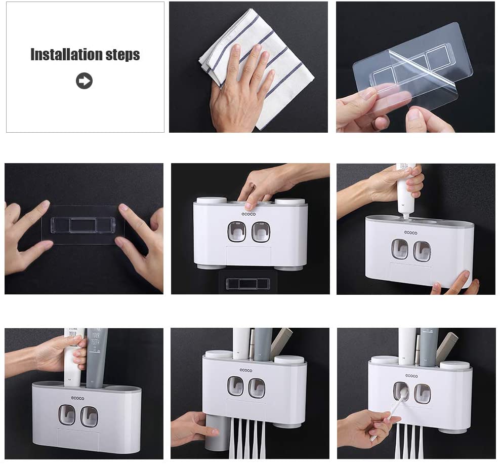 Multi-functional combination: a set of products containing 2 automatic toothpaste dispenser for children and adult, 4 dustproof environment friendly cup for 4 member of family, dust toothbrush holder, multi-functional incorporating shelves, a set of products to solve the problem of incorporating toiletries of a family.