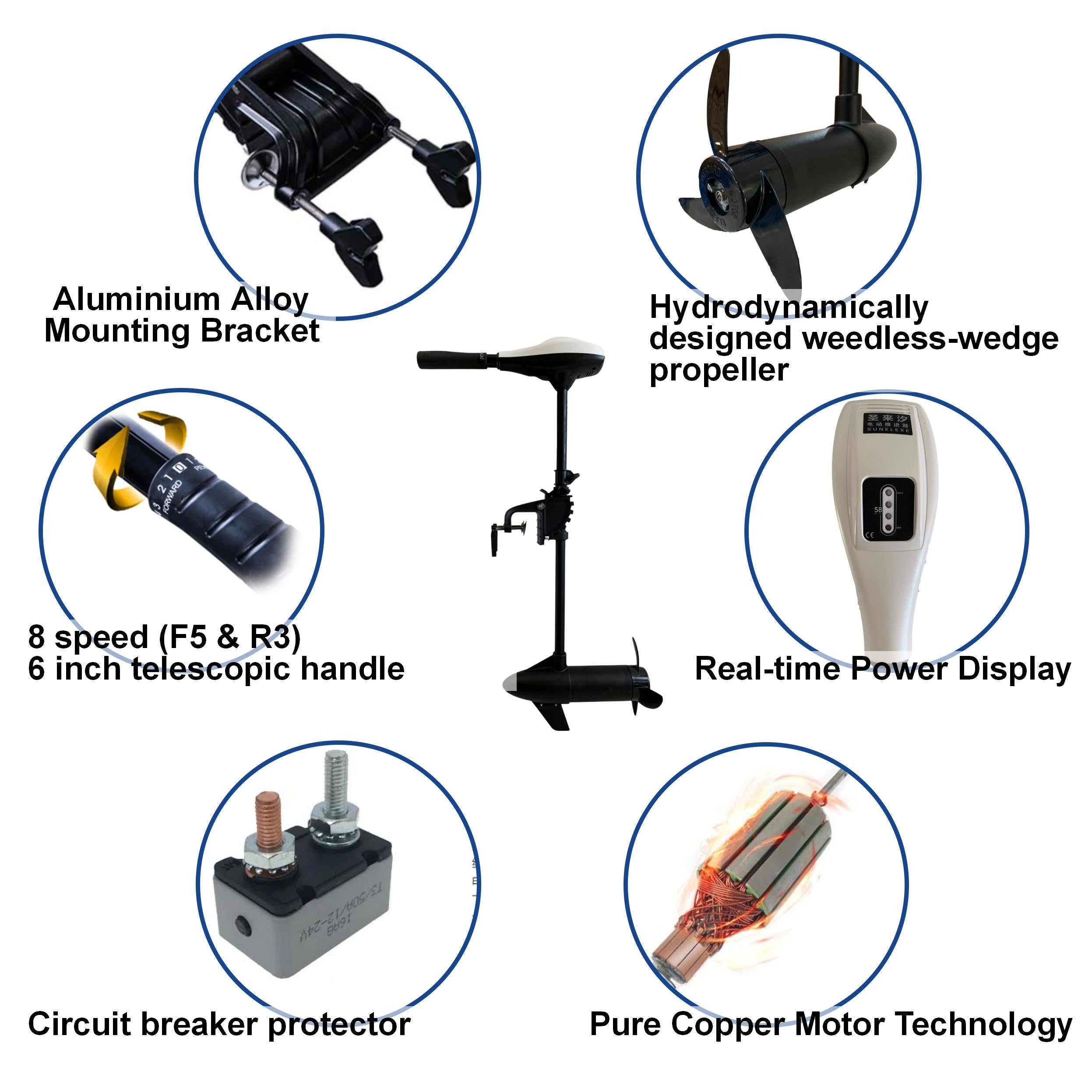 The 66 Thrust Electric Outboard Motor is hydro-dynamically designed with a weedless-wedge propeller with a high performance blade geography. It can be used in both saltwater and freshwater, it also has a flexible and high strength fibre glass composite shaft.