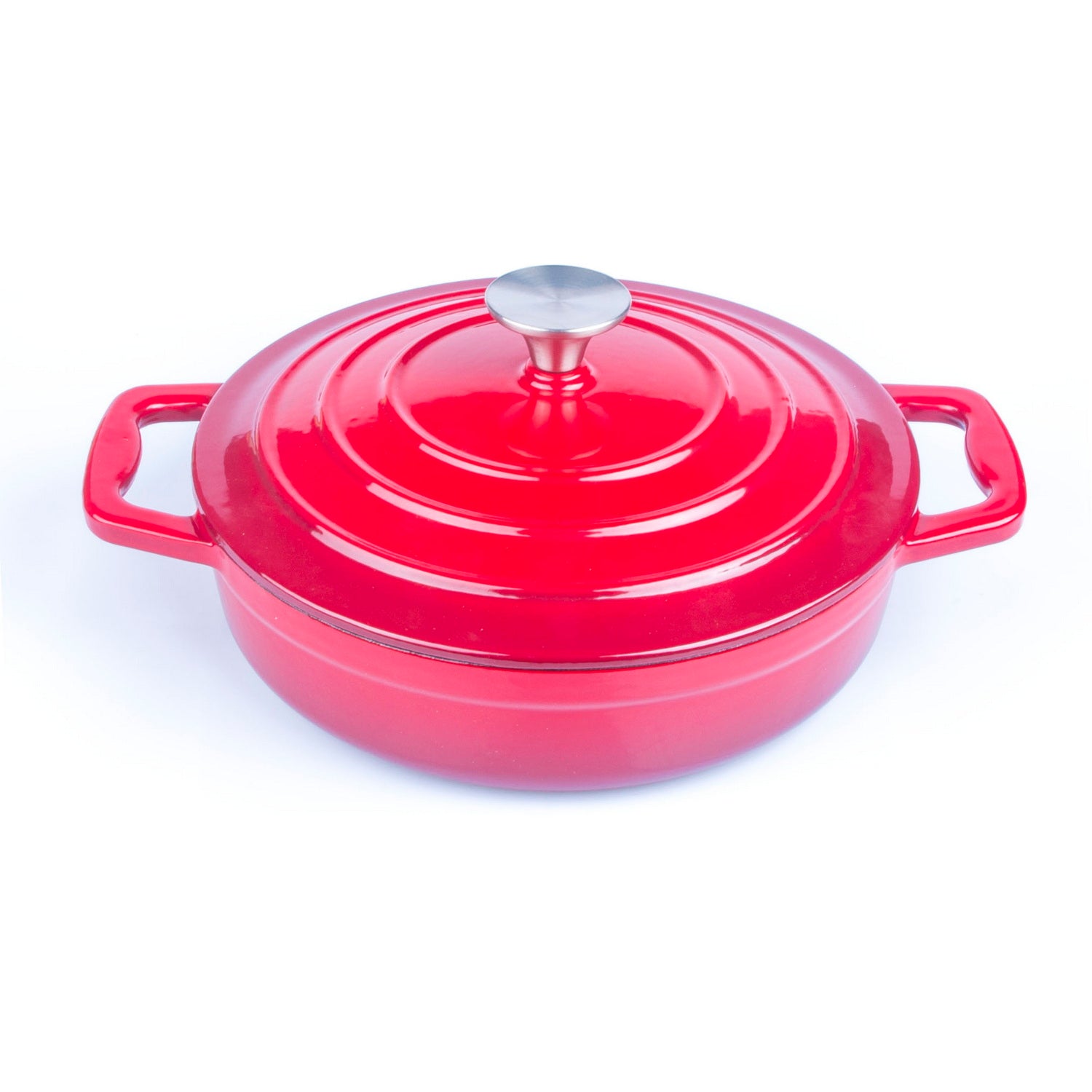 Enamel coated cast iron cookware are a must-have kitchen item for any serious home cook. Cast iron casserole braiser pan is oven and heat safe at temperatures of up to 500F (200degree). 3.8 quart casserole dish with lid features 23cm wide diameter size for large serving meals and includes cool touch handles stainless steel lid knob.