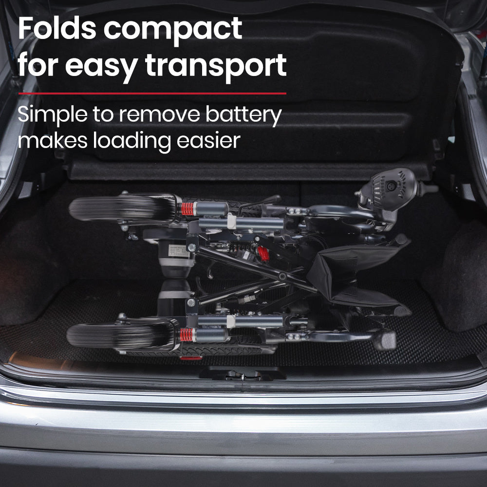 The Equipmed motorised wheelchair is quick to fold. Plus, a sturdy steel frame and easy-to-remove lithium battery mean that it is as light as possible for loading into a car boot or moving into a space-saving storage position.