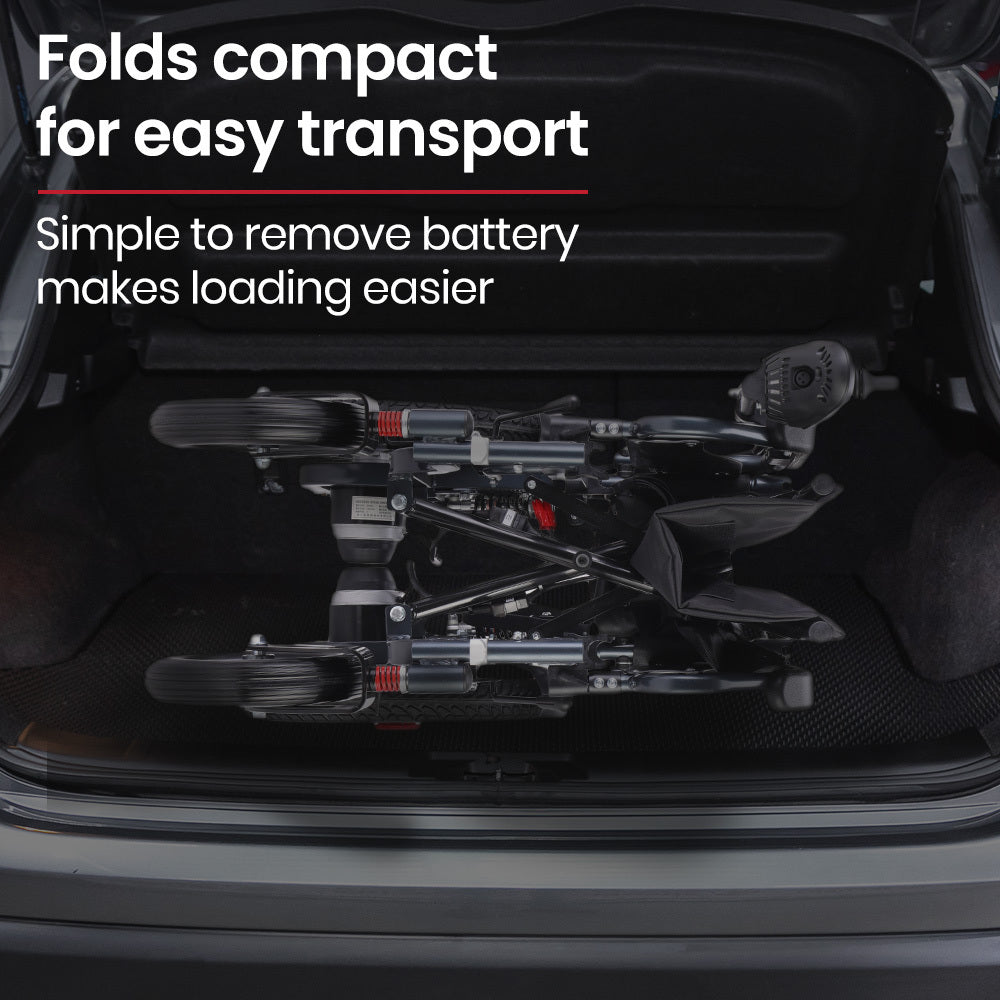 The Equipmed motorised wheelchair is quick to fold. Plus, a sturdy steel frame and easy-to-remove lithium battery mean that it is as light as possible for loading into a car boot or moving into a space-saving storage position.