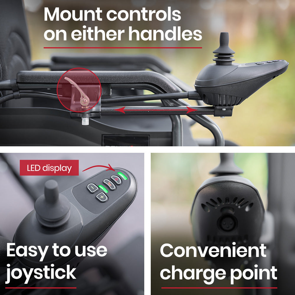 Steering is intuitive using the joystick that can be mounted on either the left or right-hand side, and with easy-to-read LED controls. You can travel along at a sensible speed of up to 6km/h, which is a brisk walking pace.