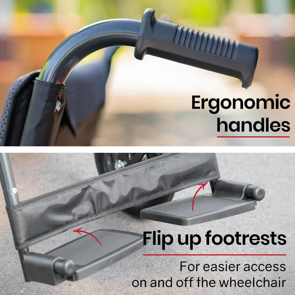 There are easily accessible mesh pockets under each armrest as well as a reading material pouch behind the backrest. Easily removable and machine washable seat and backrest cover for convenience.