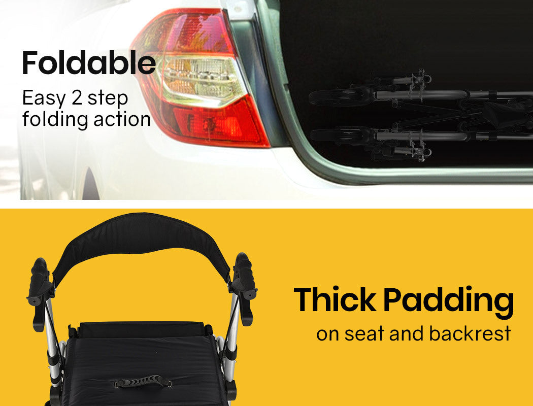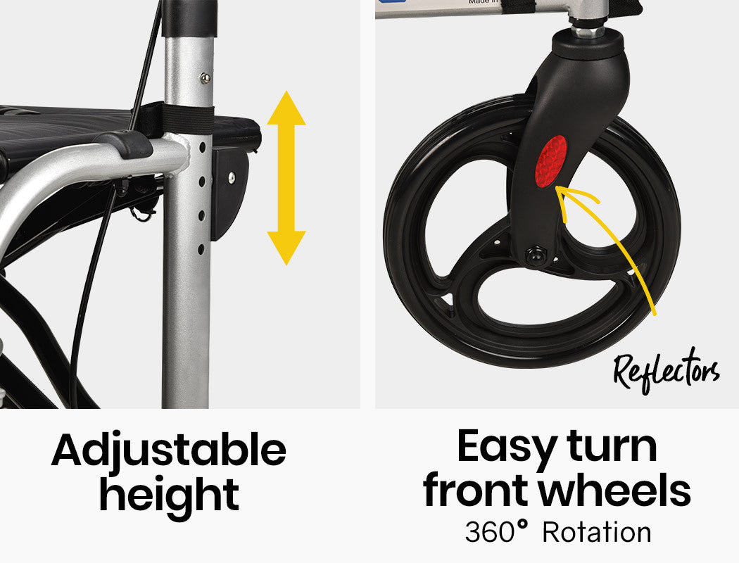 Venture outside on the large 8†PVC wheels which are designed to roll the walking frame smoothly over the bumps inside and outside. Activating the park brake ensures you have a stable seat for a rest to watch the world go by.