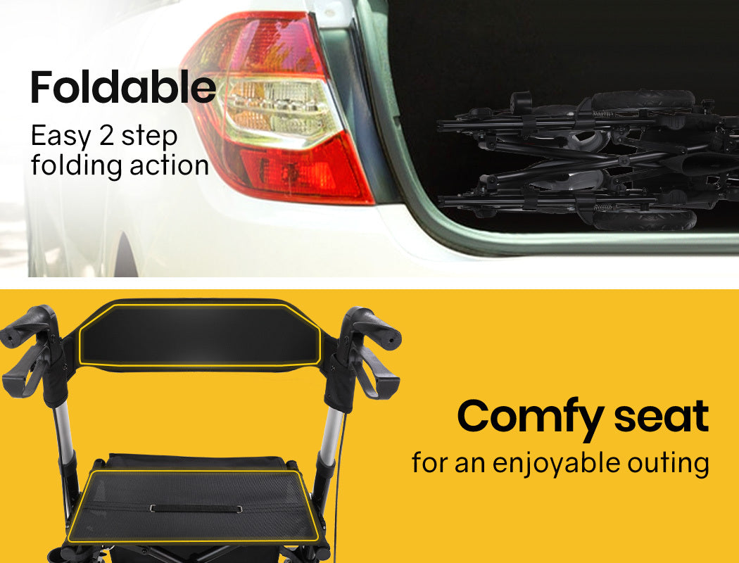 Venture outside on the large 8†wheels which are designed to roll smoothly over the bumps inside and outside, and have reflectors for peace of mind. The comfortable seat with padded back rest comes in handy when you’ve found a pleasant spot to watch the world go by, or perhaps simply feel like a rest when waiting in line. Simply push the handles down and the walker is locked into place.