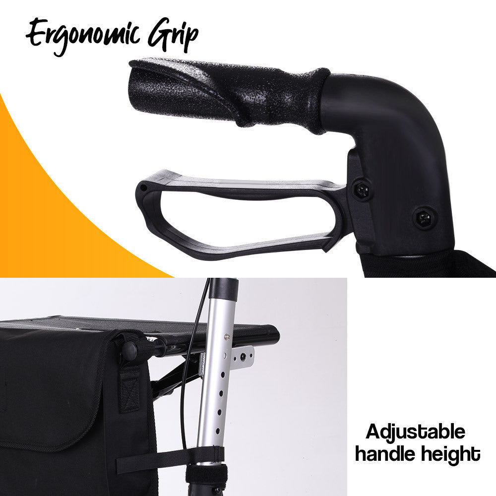 Venture outside on the large 8†rubber wheels which are designed to roll smoothly over the bumps inside and outside, and have reflectors for peace of mind. The comfortable seat with padded back rest comes in handy when you’ve found a pleasant spot to watch the world go by, or perhaps simply feel like a rest when waiting in line. Simply push the handles down and the walker is locked into place.