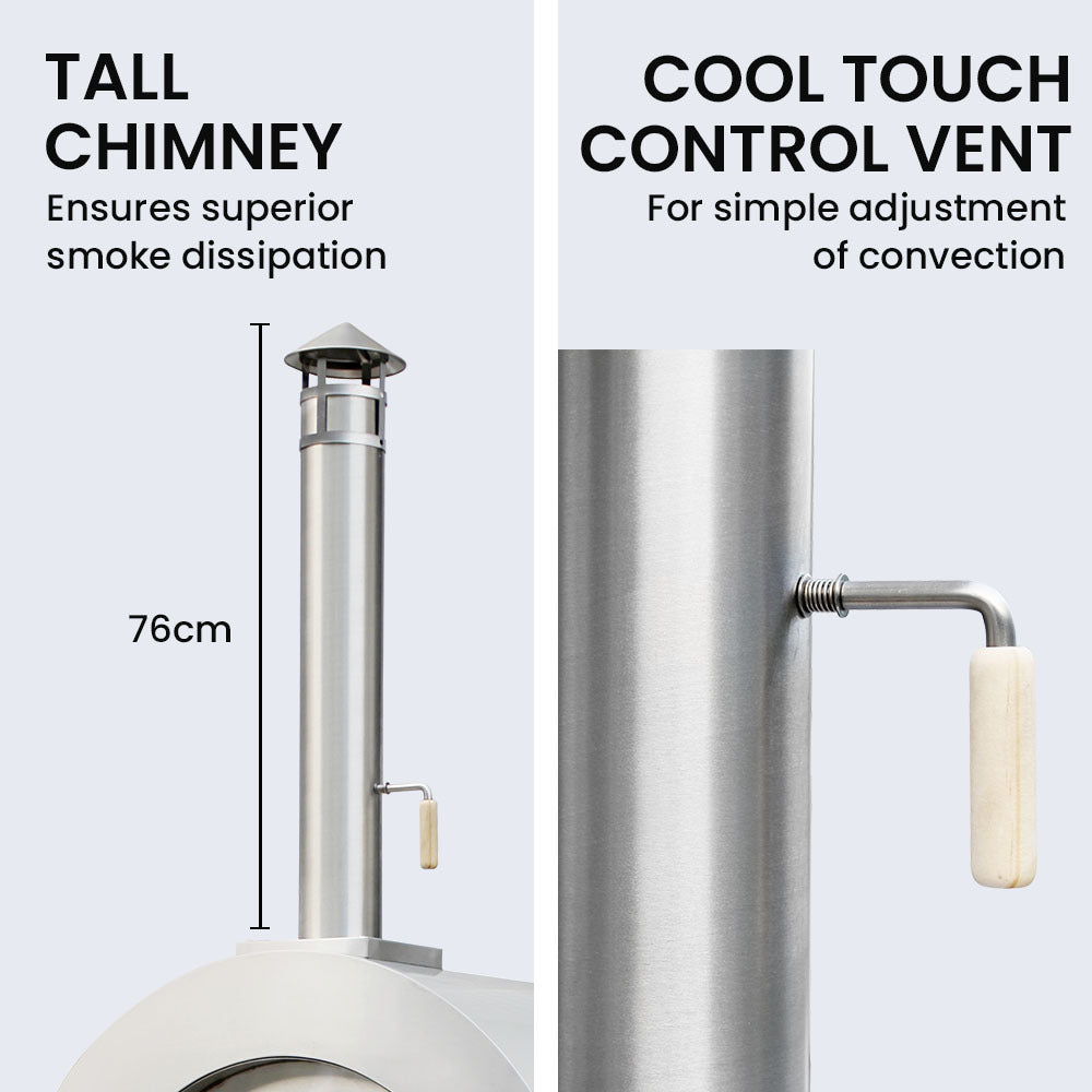 This EuroGrille comes with everything you need to cook and maintain, including side hooks, oven brush, pizza cutter and server as well as stainless steel pizza peel. The wooden vent control and door handle are cool to touch, and the extra tall chimney ensures effective smoke dissipation for a superior cooking experience. The EuroGrille pizza oven sits on castor wheels and can lock the oven into position.