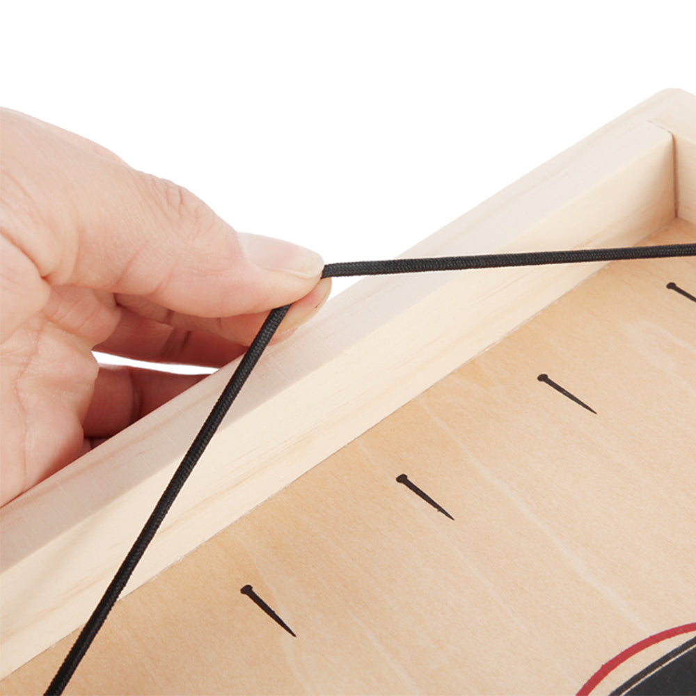 - Easy to play: Start the game and place five pucks on each side of the board. Slide both ends of the elastic band into the side grooves so that they snap into place. The two players applauded the "High Ten" style to start the game. The player uses an elastic band to launch the puck from the door until there is no puck next to it. Players don't turn, they just refill and shoot as fast as possible. Whoever clears the board first wins