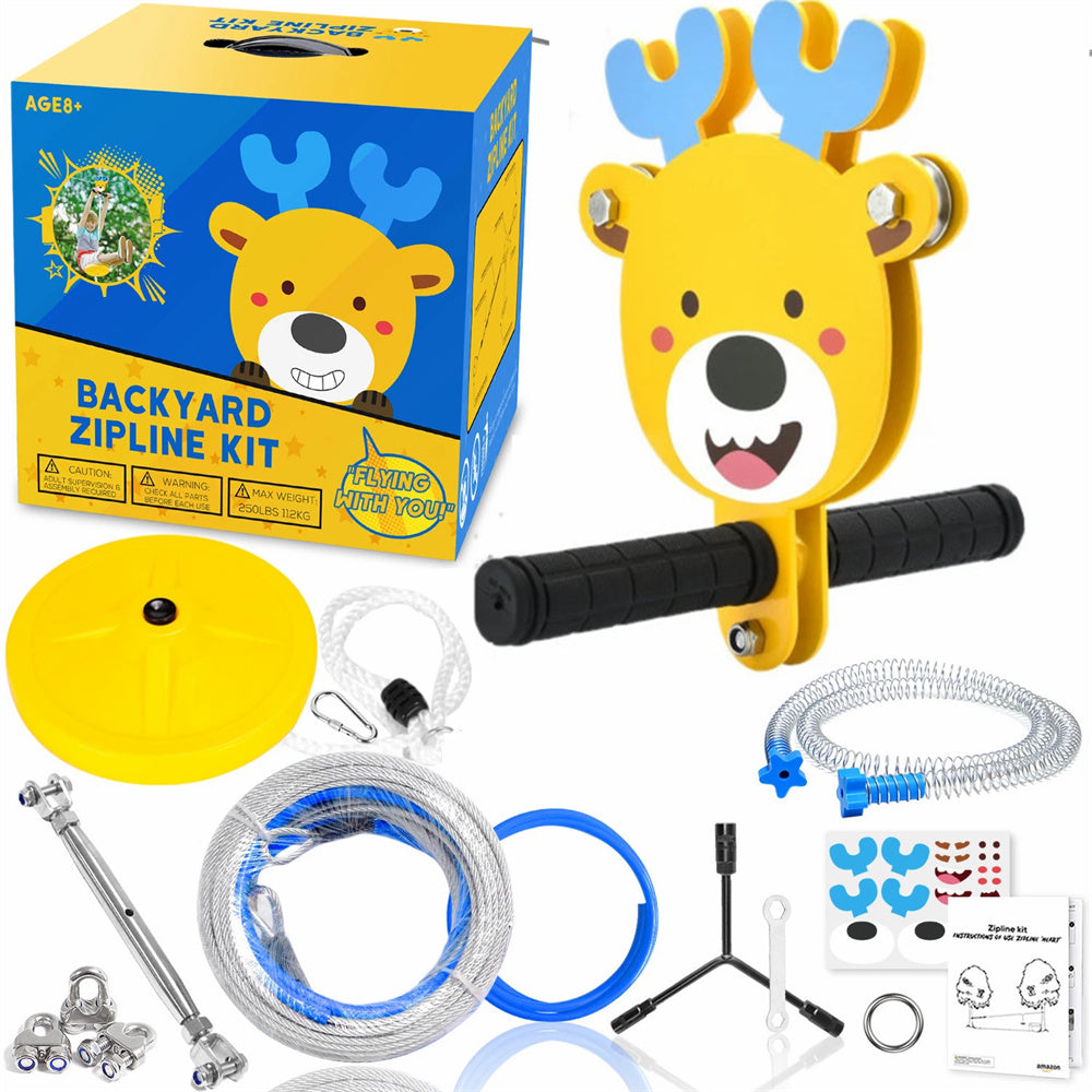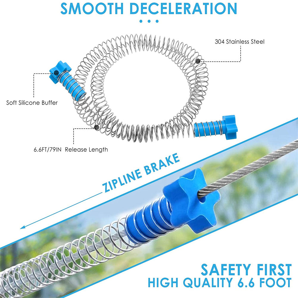 -SAFETY COMES FIRST: It easily holds up to 250 lbs SAFELY. Our zip line kits include a super 6.56FT/2M Stainless Steel Spring Brake as a braking system, so the zip line does not end at a sudden stop. When it comes to kids' outdoor activities and playground equipment, quality means the world to parents- that’s why we have carefully constructed a product that guarantees complete safety for our little ones.