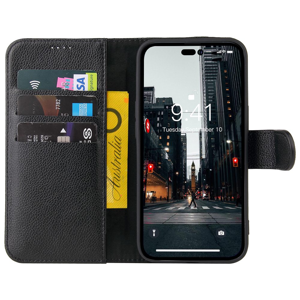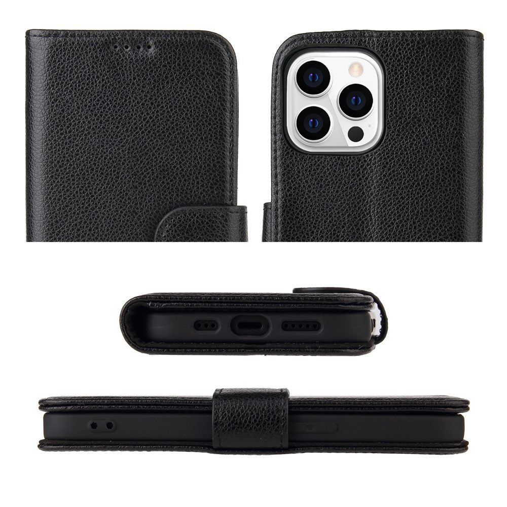 For iPhone 14 Pro Case iCoverLover Black Genuine Cow Leather Wallet Folio Cover