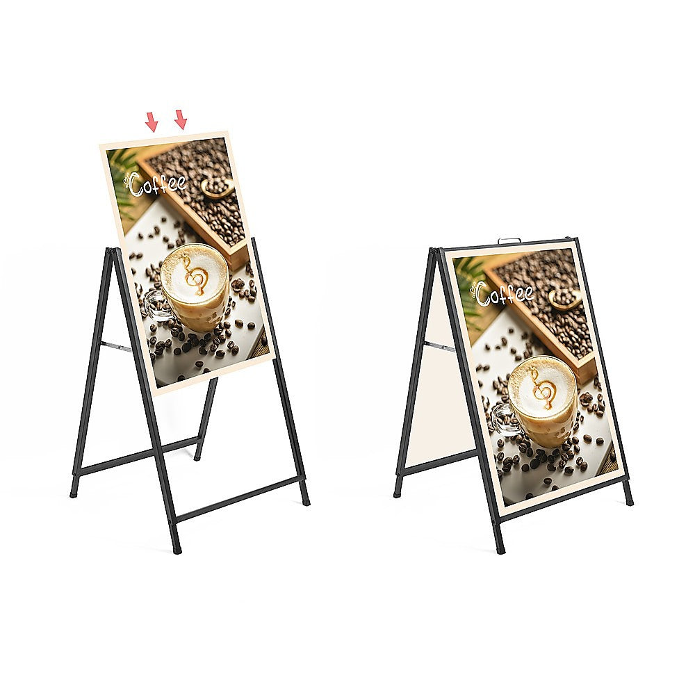 Get your message out there with this versatile Randy & Travis Machinery A-frame Sidewalk Sign. Suitable for indoor or outdoor use, this advertising poster display is a freestanding unit that has two faces on which adverts can be inserted. Ideal for use outside cafes, restaurants, pubs, bistros or salons, it's also perfect for any venue advertising an event, special offer, fresh menu choices or anything else that adds value for customers. If your retail facility has a special promotion, advertise it on this poster display frame! Attendees at trade shows, conferences, community events and expos can gain added traction by using this portable A-frame display to promote their goods and services.