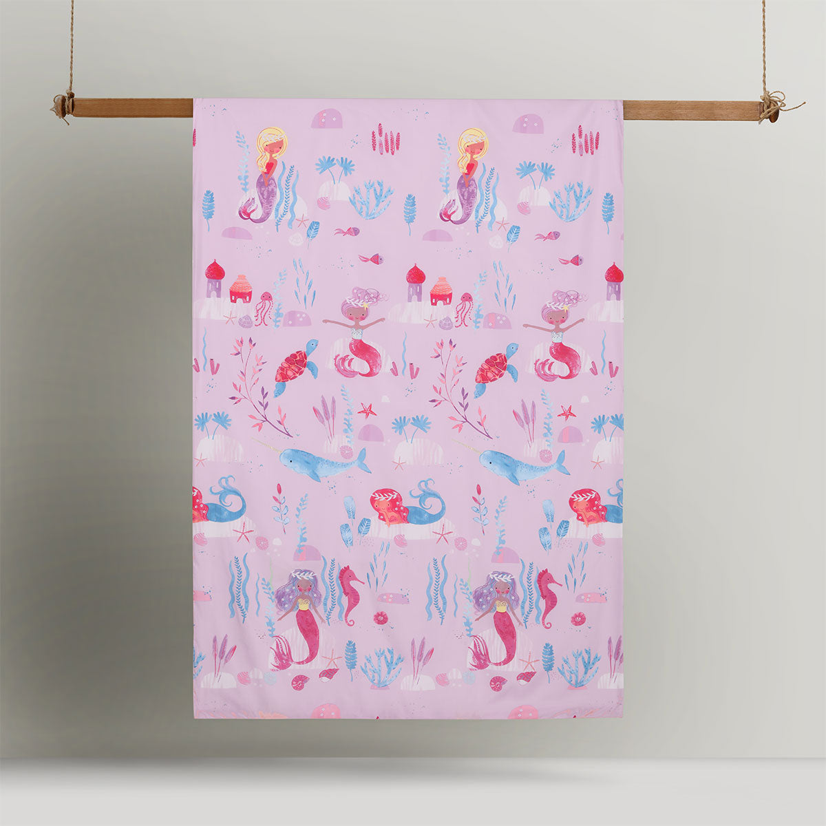Stay comfortable all year round with this Glow in the Dark Under the Sea Quilt Cover Set by Happy Kids. Great value for money! This bright and fun design could add an element of style to an otherwise plain and boring bedroom decor. The design features mermaids, seahorses, corals, and aquatic plants printed in pink, plum, blue, lilac, orange, and cream colour tones. To activate the glow in the dark feature of the Quilt Cover the lights must be left on for at least 15 minutes. Then simply turn off the lights after that and see the cool glow in the dark characters. It is made from quality microfiber polyester fabric.