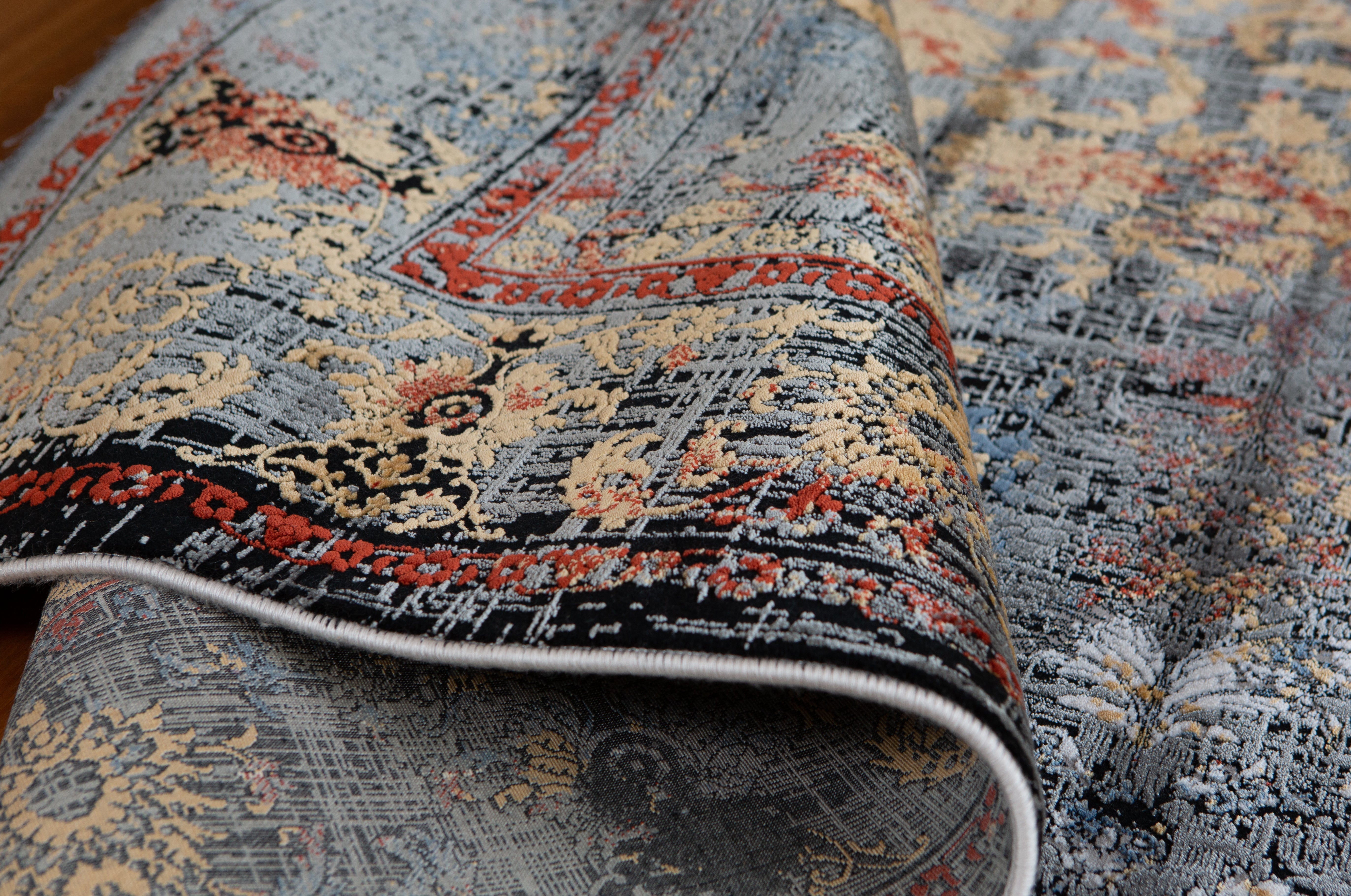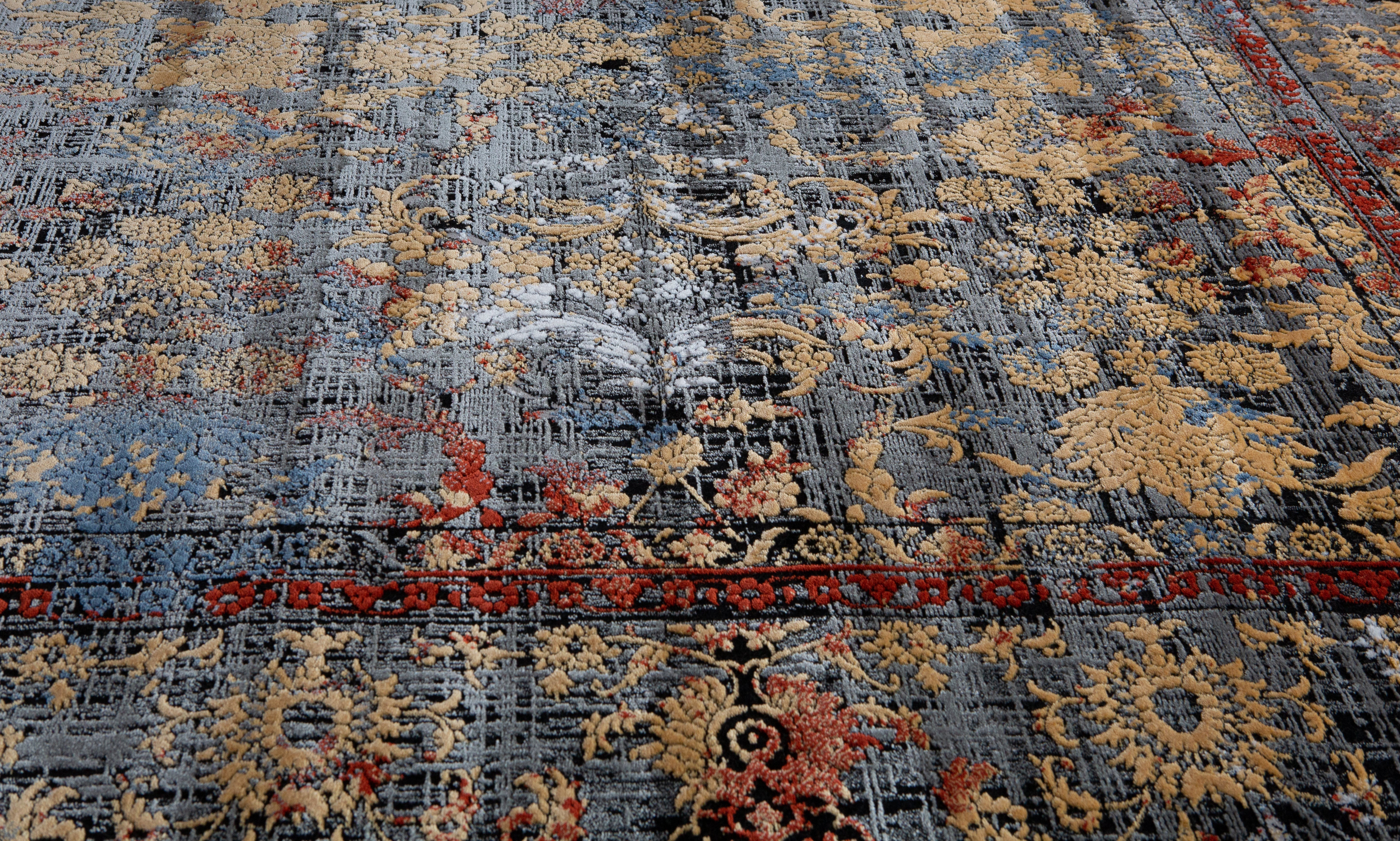 A jolly and lively display, this intricate traditional design rug invites joy and splendour to any home environment. The contrast of bright gold and red shades to the duller greyscale undertones makes the design prominent, and the white highlights introduce light and alleviating asymmetry to the artwork. Despite being machine-made, Hera retains an authentic hand-made look.