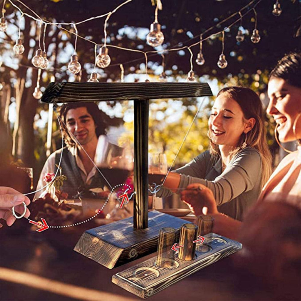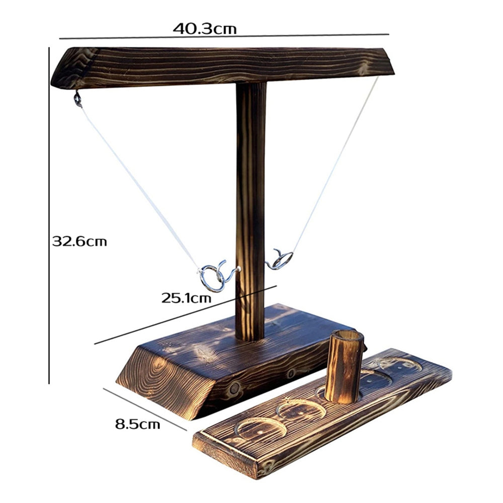 Place the wooden cup in the center circle, Take rings and go! Each time you land the hook, move the wooden cup 1 space towards your opponent. A player wins when the wooden cup moves off the end of the ladder.