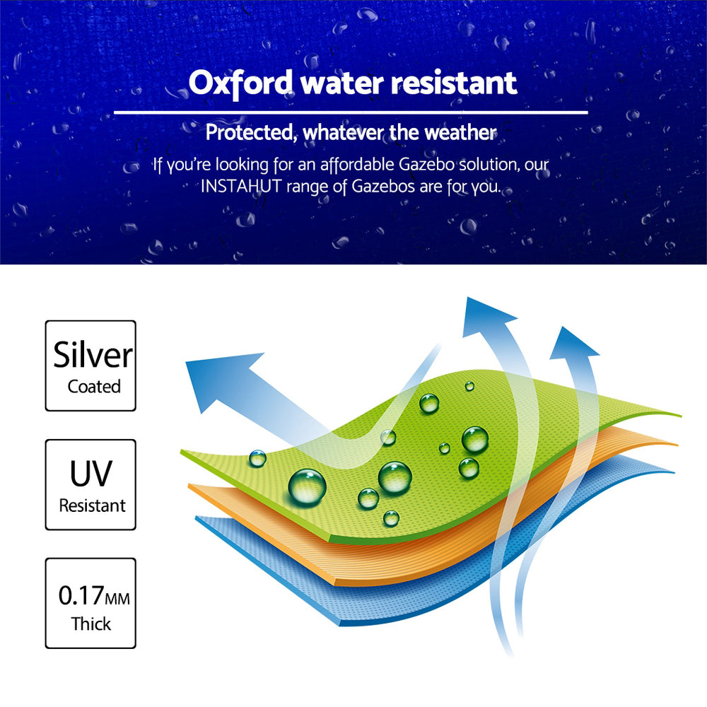Featuring high density, long lasting silver-coated oxford fabric with effective UV and water repellent treatments, this INSTAHUT 3X3 Pop Up Gazebo provides a lovely ground and canopy coverage of 300 x 300cm. It is perfect for all your upcoming outdoor activities, as a sunshade station as well as a shelter for unexpected rains.