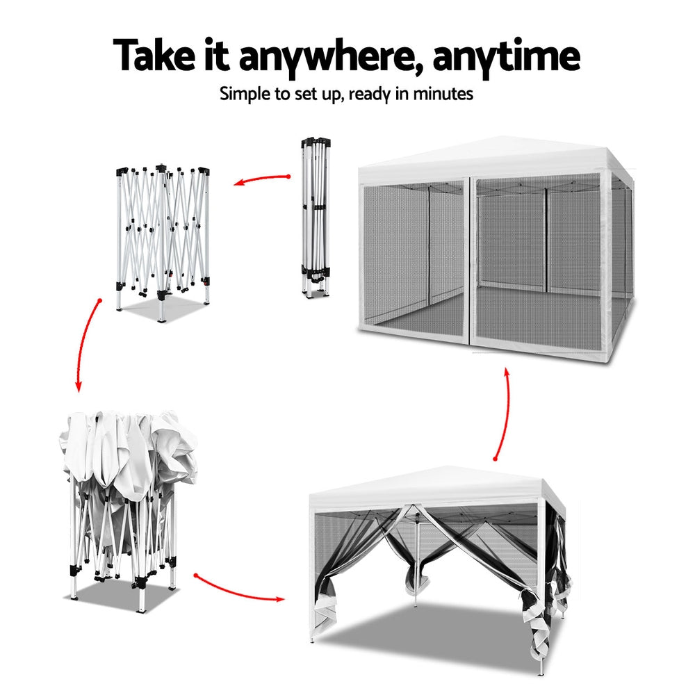 In your garden, at an outdoor BBQ or sports event, on your travelling vacation or on market days, our INSTAHUT Pop-up Gazebo is your ideal solution for instant cover outdoors. With a wide roof coverage of 300cm by 300cm, the exceptional cover is made of durable silver coating 210D Oxford fabric that is both UV and water resistant. Height can be easily adjusted with four pre-sets, ranging from 232cm to 250cm. It also features two zipped entrances and insect-proof mesh walls. Plus, the powder-coated steel frame, cross-bar frame work and steel supporting legs mean that this gazebo is no easy pushover from man or weather. The gazebo can be set up in minutes and kept away just as quickly in your car boot, van, trailer, garage or shed. Thanks to its portable design, quick and convenient hook and loop attachments, fast release and fasten rings and handy nylon inserts for hassle-free use.