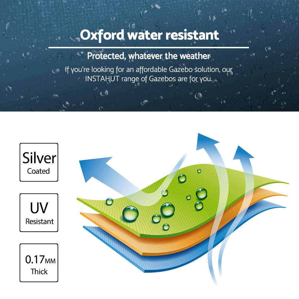 Featuring high density, long lasting silver-coated oxford fabric with effective UV and water repellent treatments, this INSTAHUT 3X4.5m Pop Up Gazebo provides a lovely ground and canopy coverage of 300 x 450cm. It is perfect for all your upcoming outdoor activities, as a sunshade station as well as a shelter for unexpected rains.