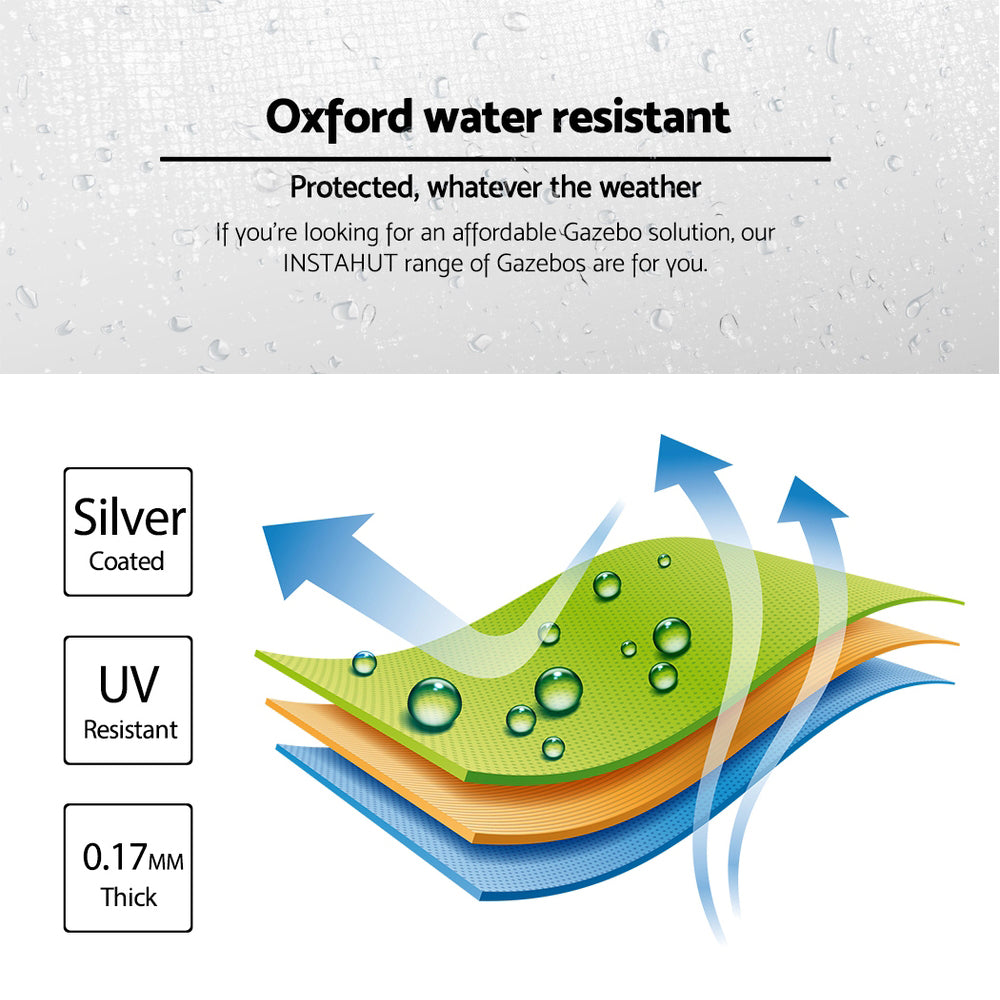 Featuring high density, long lasting silver-coated oxford fabric with effective UV and water repellent treatments, this INSTAHUT 3X4.5m Pop Up Gazebo provides a lovely ground and canopy coverage of 300 x 450cm. It is perfect for all your upcoming outdoor activities, as a sunshade station as well as a shelter for unexpected rains.