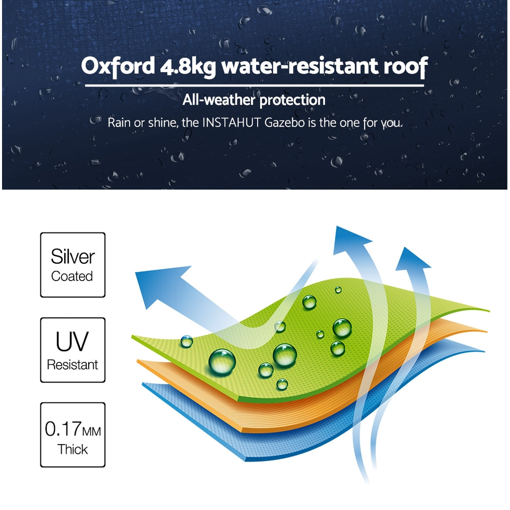 Featuring high density, long lasting Silver coated oxford fabric with effective UV and water repellent treatments, this INSTAHUT 3X4.5m Pop Up Gazebo provides a lovely ground and canopy coverage of 300 x 450cm. It is perfect for all your upcoming outdoor activities, as a sunshade station as well as a shelter for unexpected rains.