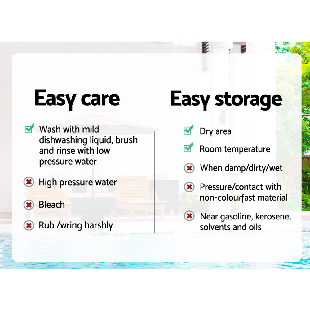 Time to go out and enjoy the good weather with an Instahut Outdoor Umbrella. With high-quality water and UV resistant polyester fabric and durable steel construction, the Instahut Outdoor Umbrella will last you through all seasons. With a 3m diameter, the umbrella offers plenty of coverage for your table, friends and family. The tilt function allows you to adjust the shade according to the sun's position, while the fail-safe crank system and 8 steel support ribs make it easy to open and close as needed. Use the umbrella anywhere from the beach to the back patio. It's even easier to maintain – just wash with low pressure water and mild dishwashing liquid, and store in a cool, dry place when not in use. It's that simple! For the easiest summer protection, choose an Instahut Outdoor Umbrella.