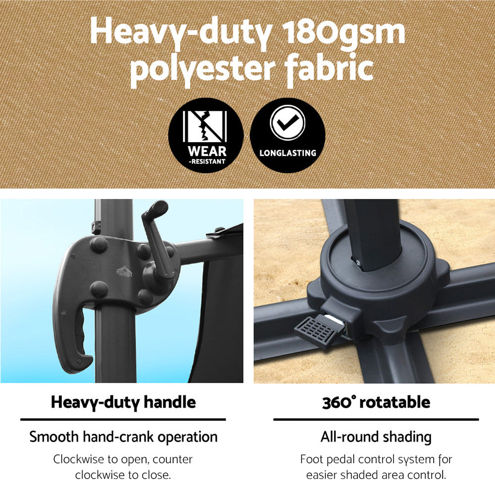 Our outdoor umbrella features a waterproof and UV-resistant 3m fabric top with upgraded UV50+ protection, supported by a cantilevered aluminium side post. A hand cranking system is used to open and close the umbrella while the foot-operated pedal helps to adjust the shading. The entire ensemble is made of durable steel and the