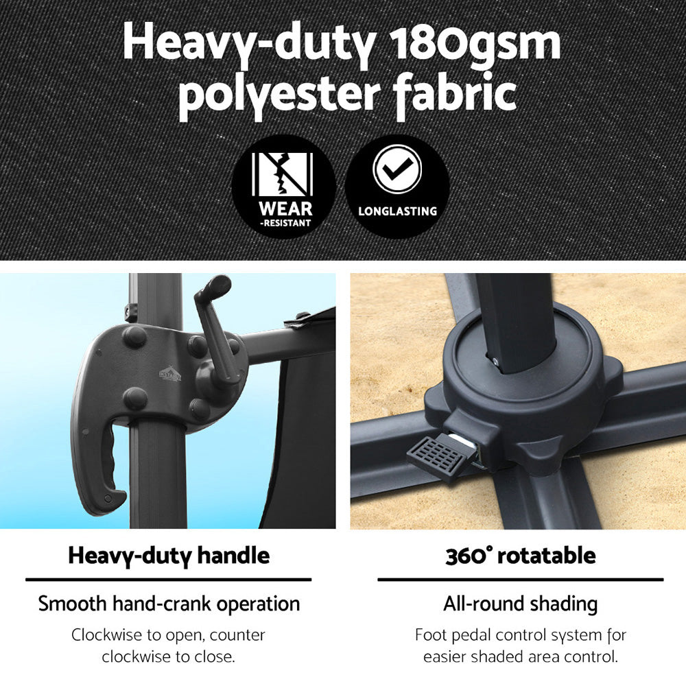 Our outdoor umbrella features a waterproof and UV-resistant 3m fabric top with upgraded UV50+ protection, supported by a cantilevered aluminium side post. A hand cranking system is used to open and close the umbrella while the foot-operated pedal helps to adjust the shading. The entire ensemble is made of durable steel and the