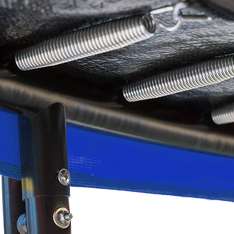 This is a heavy trampoline and uses linked legs and grounding straps for superior stability. The structure of the legs also minimises the tendency for legs to dig into the ground.