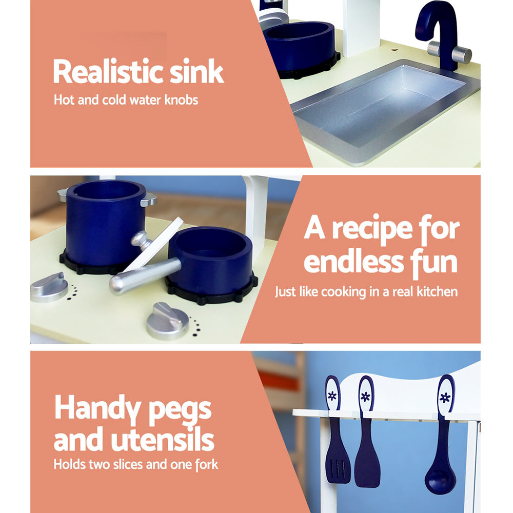 A stunning kitchen for role play that your little aspiring cook would adore! Let your little chef get creative and have fun while cooking with our Keezi fully-equipped kitchen play set. This beautiful kitchen play set is like a dream come true and feels like a real thing. It is packed with unlimited hours of entertainment and learning. Plus, it supports the development of language, social and organisation skills in children.