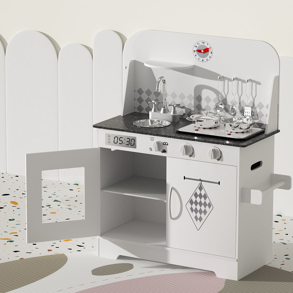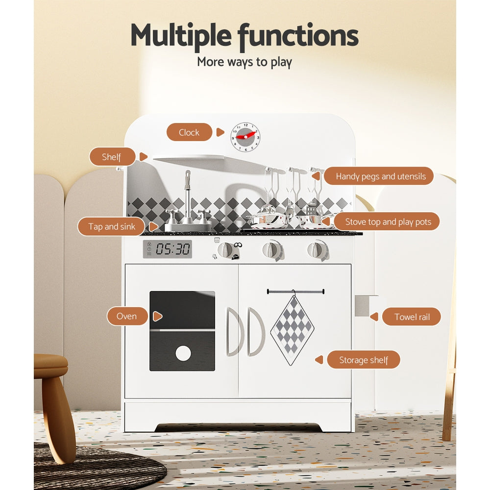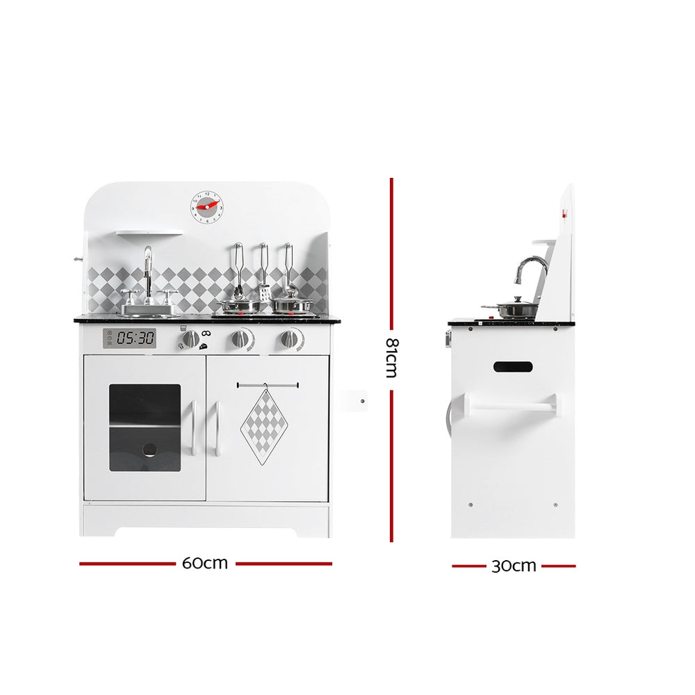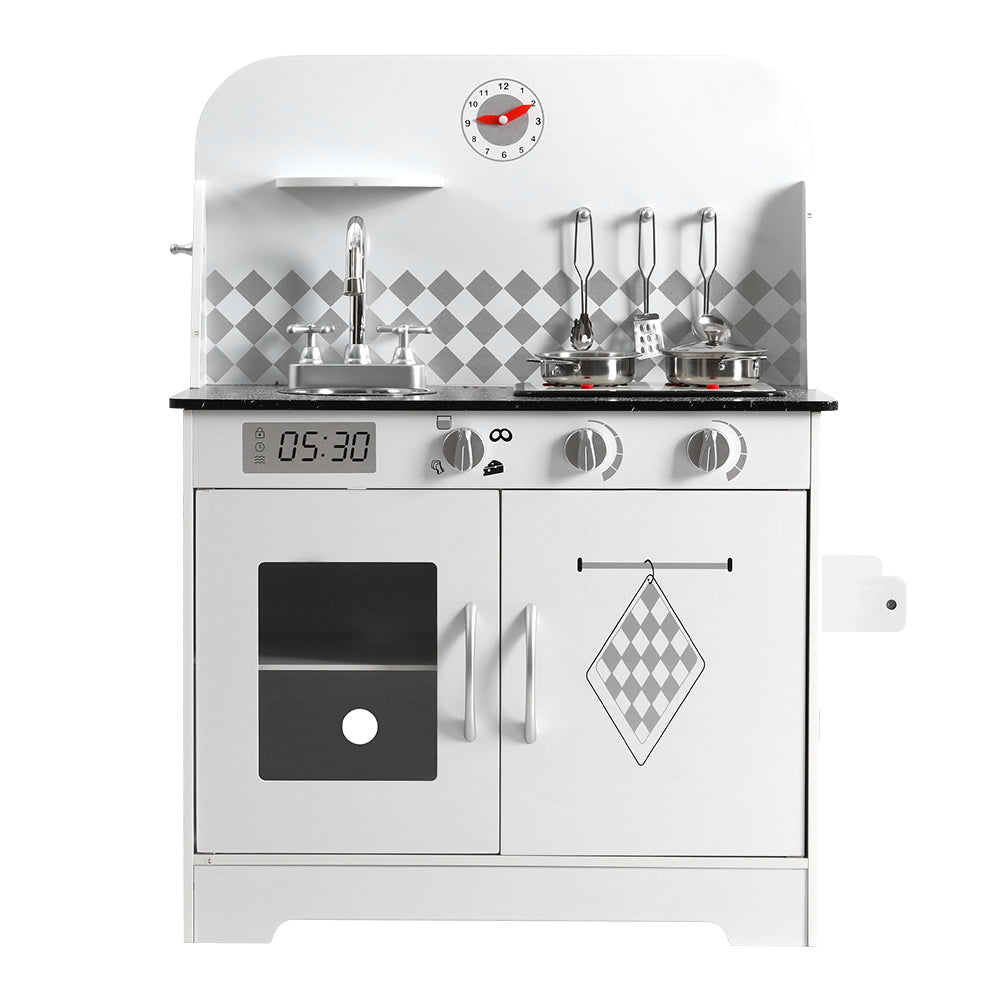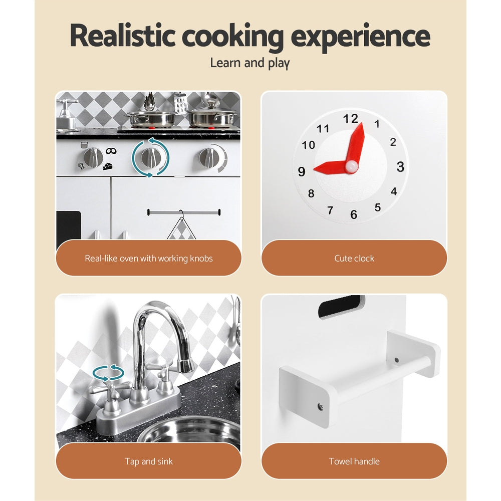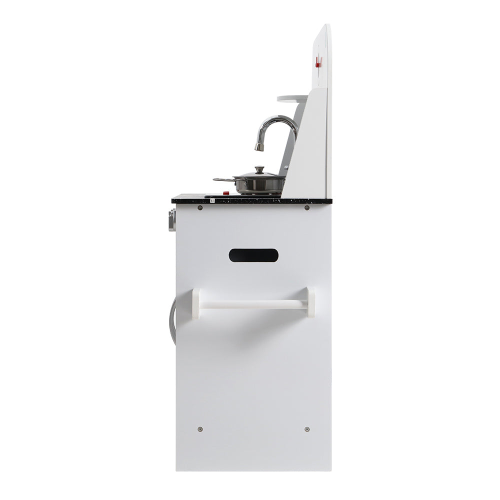 Every little aspiring cook needs their kitchen set! Let your little ones have fun cooking with our Keezi fully equipped modern kitchen play set. Our kitchen set comes with all modern kitchenware and appliances. It has an elegant towel rail, storage cabinet, tap and sink, stove top and play pots, oven with working knobs and door, and cute clock for a real-like cooking experience. Made from a combination of solid wood and MDF, the kitchen set is sturdy and durable. It comes with safety and quality approval and non-toxic paint finish for your child’s safety. Now your young chefs can develop several basic life skills all while cooking and serving delicious meals for you. Go and get your kids in the Keezi kitchen today.