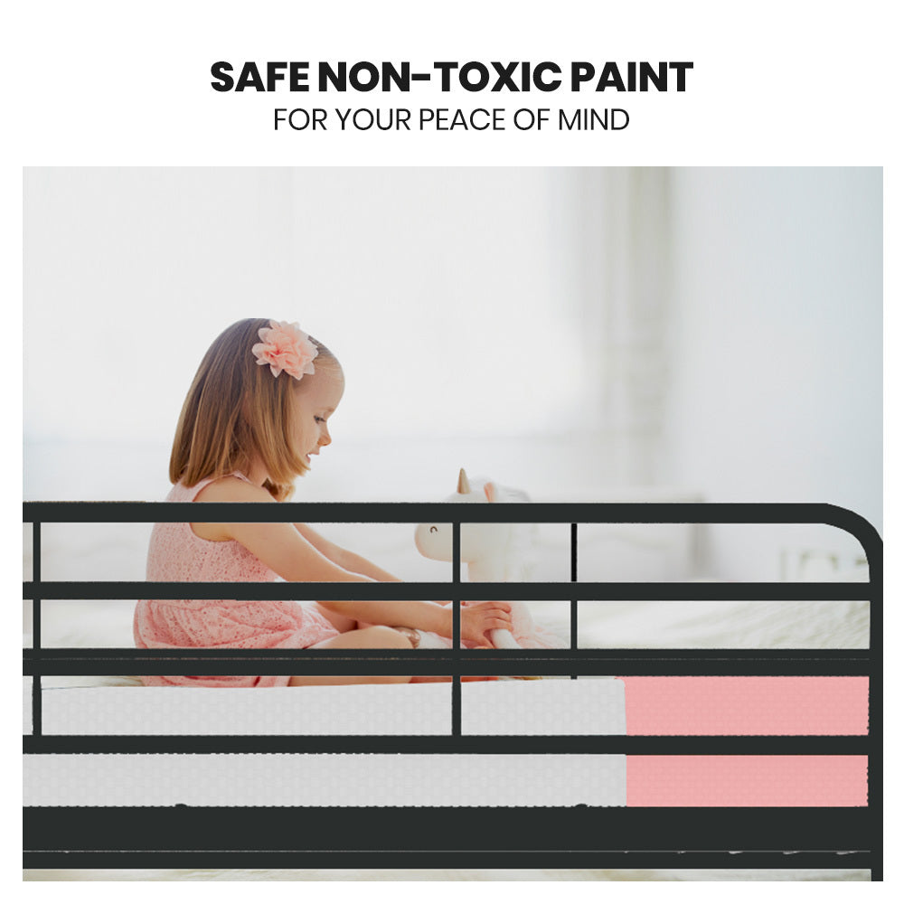 The strong tubular metal frame has a matte dark grey non-rust finish with matching fasteners–so this bunk bed not only looks great, but is also built to last! Soft rubber feet ensure that the bed can be placed on any floor type without the risk of scratching. With safety in mind, this bunk bed has no sharp edges and smooth welded joints. It also features a solid and secure fixed ladder that is easy to climb without the wobbles of other less sturdy bunk beds.