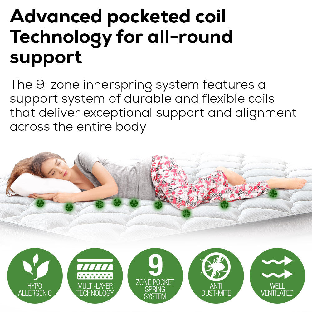 Kingston Slumber mattresses come with 6 Coil-9 Zone thick banded pocket springs that ensure you experience the most tranquil sleep. When you change position, the cushioning EuroTop exterior lining allows for an effective flow of air in and out of the mattress. All these features work in harmony to deliver a state-of-the-art therapeutic mattress solution that will provide consistency in your sleep cycle well into the future.