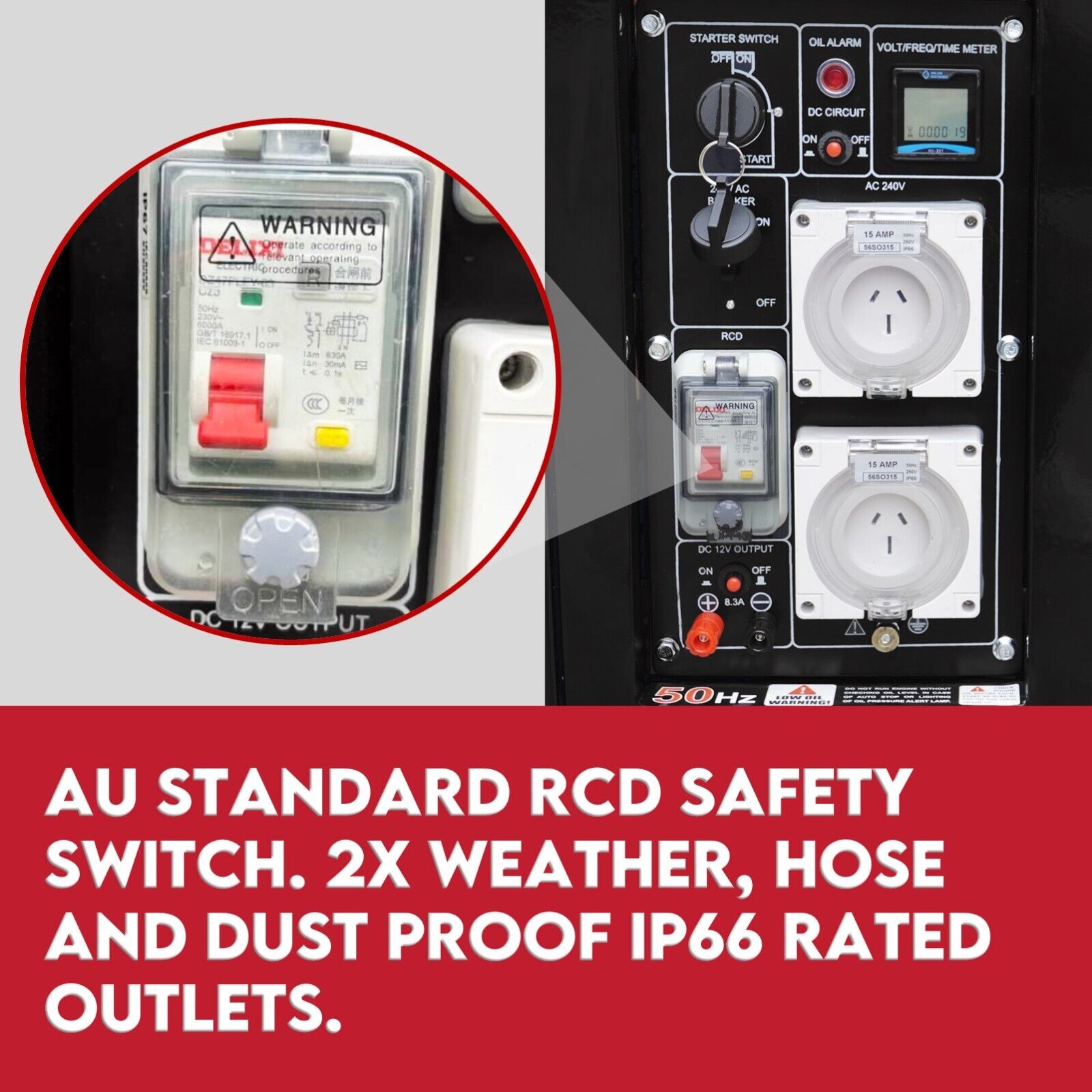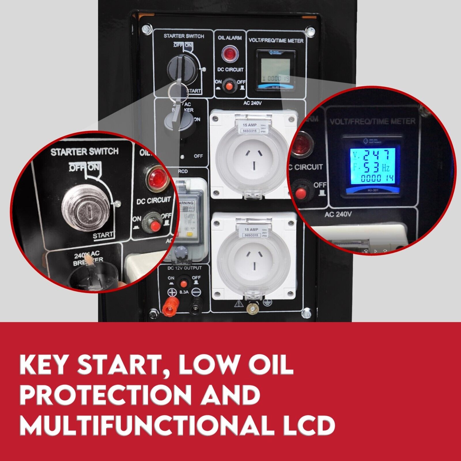 Featuring 2x heavy-duty IP66 rated 15A 240V power outlets, plus an 8.3amp 12 volt DC outlet - it could comfortably run a whole range of tools, white goods and lighting. Adding to its commercial application, it features an RCD safety switch for additional OH&S assurance. The unit's user-friendly design is facilitated by its electric key start, overload protection, low oil indicator and multifunctional LCD monitor.