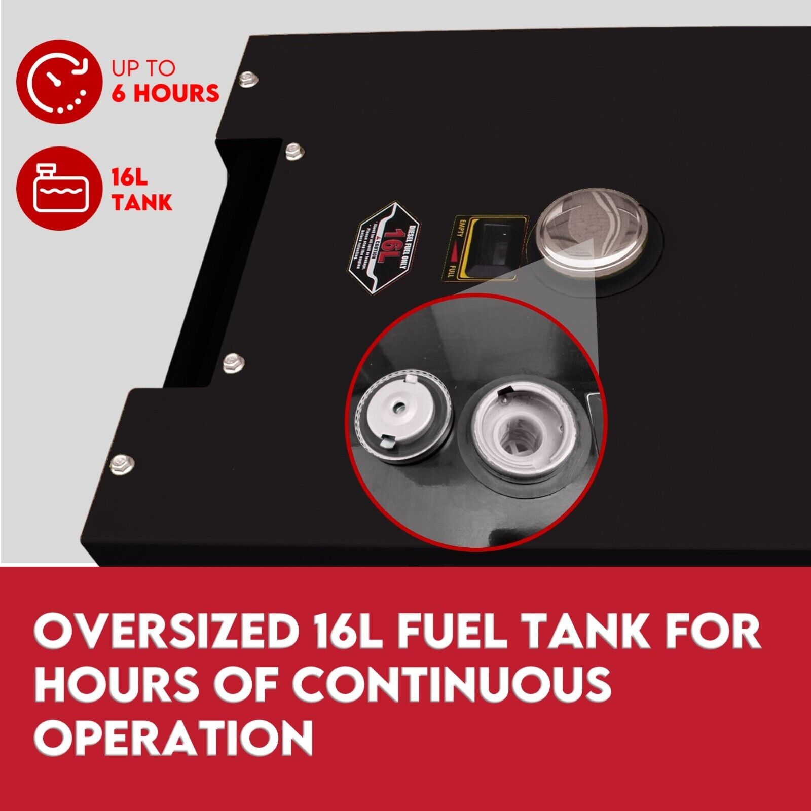 This generator can be wired into your home or business' electrical system. Its 16L fuel tank can run unattended for up to 6 hours straight even when the main power is cut. With its patented super silent enclosure you will continue on powering the house without waking the neighbours. It also includes roller wheels for when transporting is required and can be removed for stationary purposes.