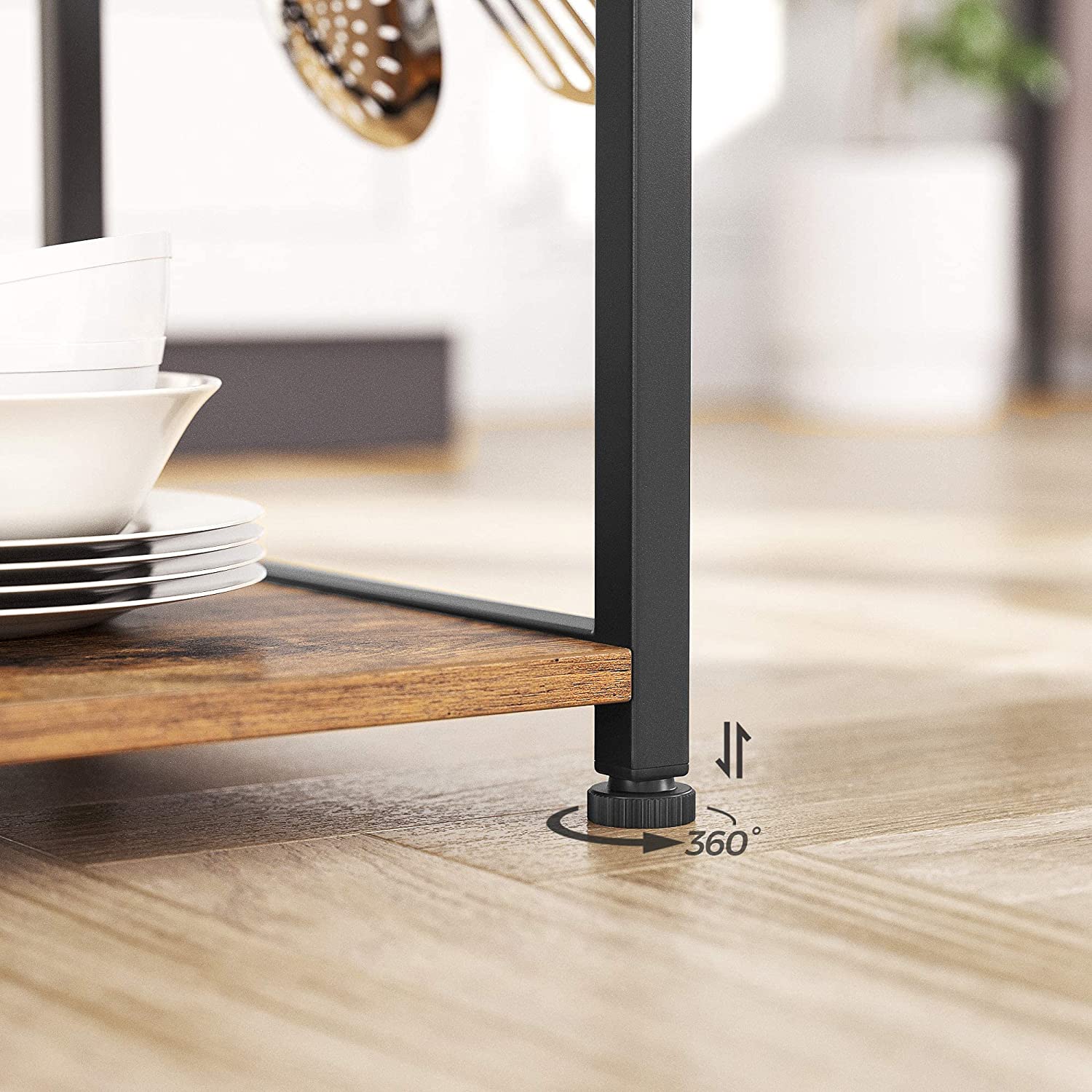 Serene Stability: Made from durable particleboard and a sturdy metal frame with 20 x 20 mm tubes, this stable microwave stand offers the support your kitchen goodies need, adjustable feet on the bottom help keep everything in place, even on uneven floors